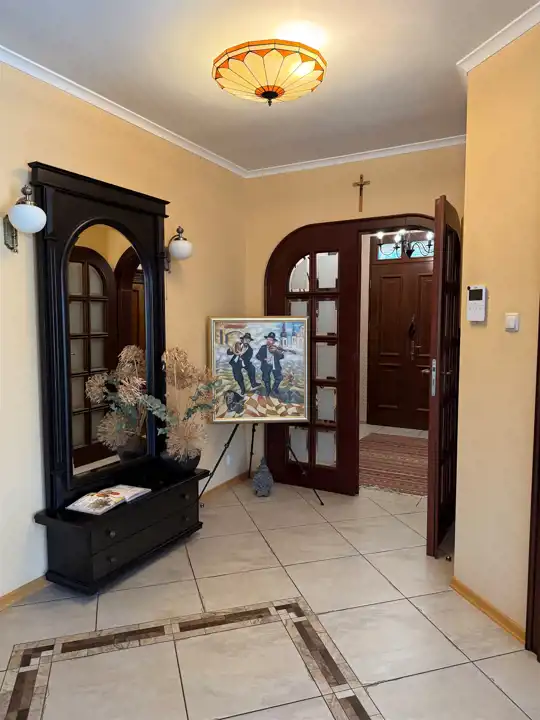 Dom wyróżnia się również przestronną strefą wejściową – hol i wiatrołap o łącznej powierzchni 32,6 m², które podkreślają reprezentacyjny charakter nieruchomości.