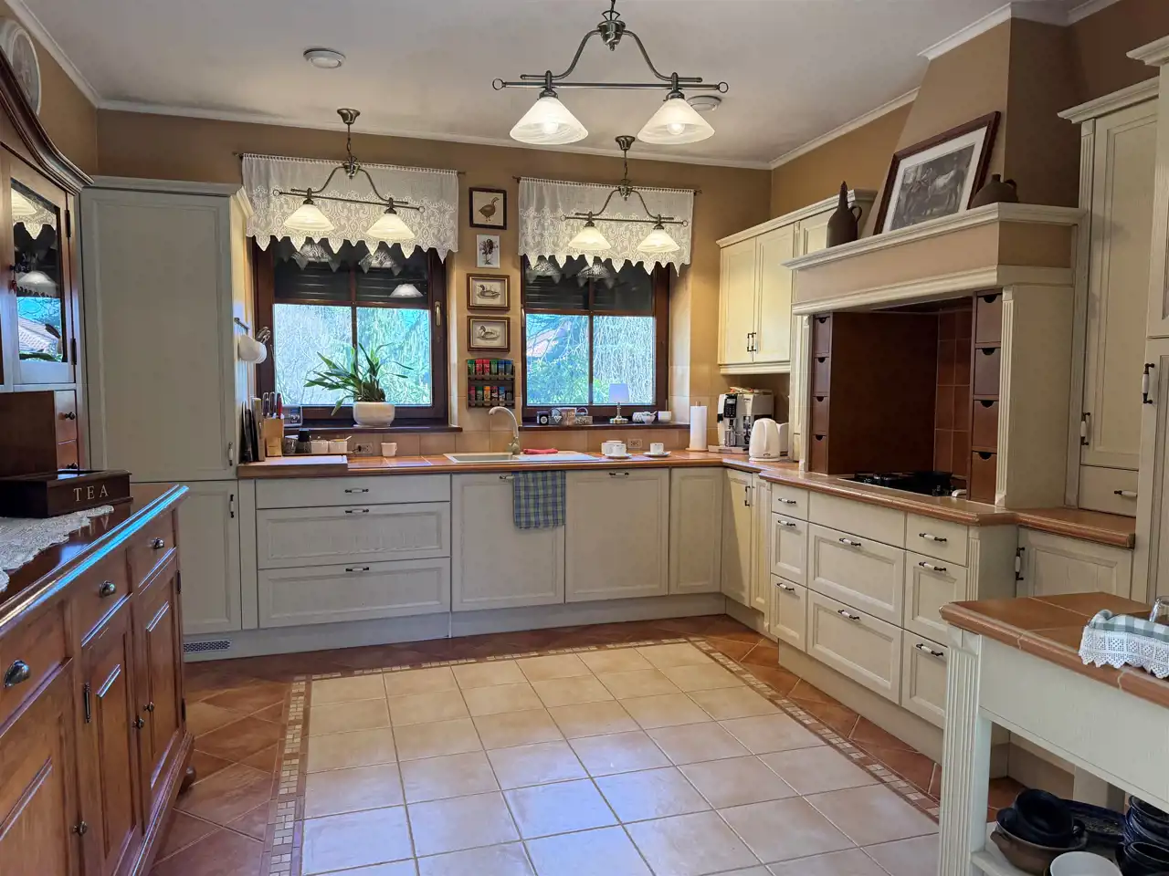 Stylowa kuchnia o powierzchni 15 m² została uzupełniona o spiżarnię (2,4 m²) – praktyczne rozwiązanie doceniane przez miłośników gotowania.