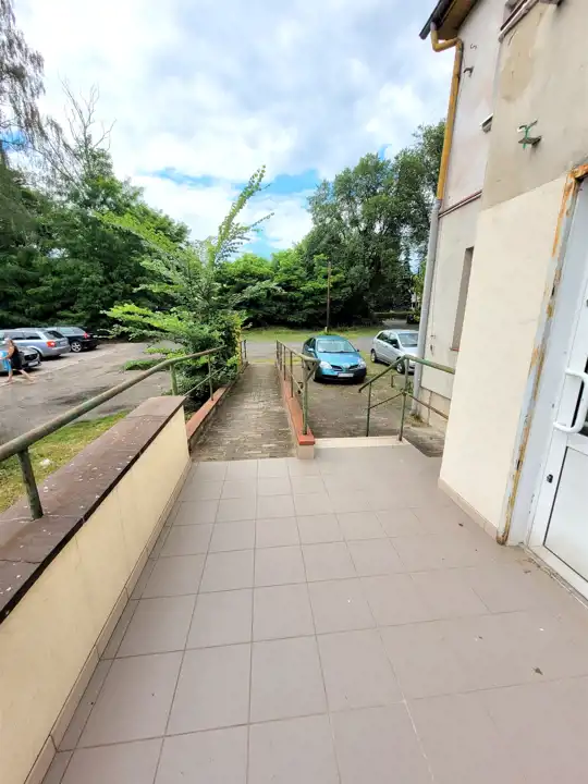 Przy budynku, bezpośrednio przy rampie znajdują się dwa przynależne, wybrukowane miejsca postojowe.