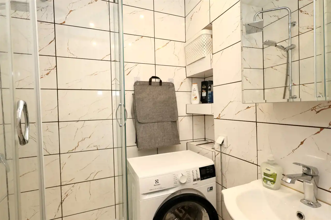 - łazienka z prysznicem, WC, umywalką oraz pralką
