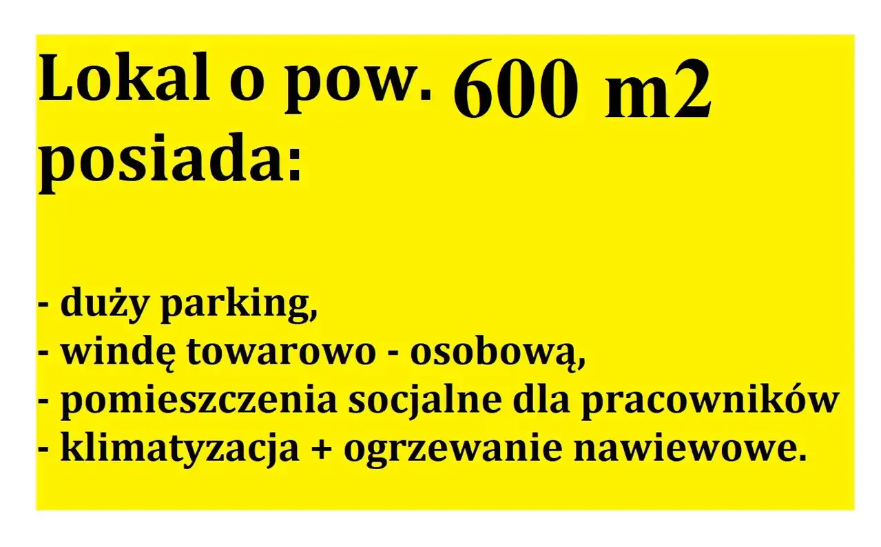 Budynek wyposażony jest w dużą windę osobowo - towarową, posiada 2 wyjścia ewakuacyjne oraz duży parking dla klientów.