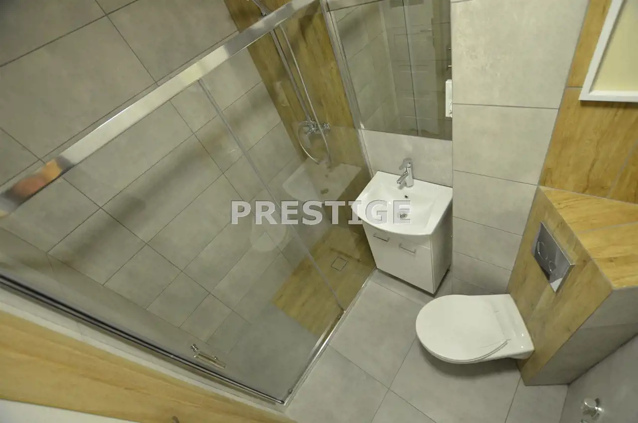 Łazienka z wc cała w glazurze, nowa armatura sanitarna, wygodna szeroka kabina prysznicowa.