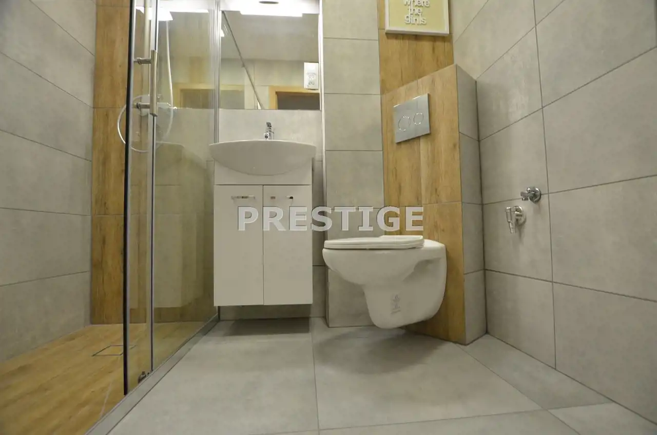 Łazienka z wc cała w glazurze, nowa armatura sanitarna, wygodna szeroka kabina prysznicowa.