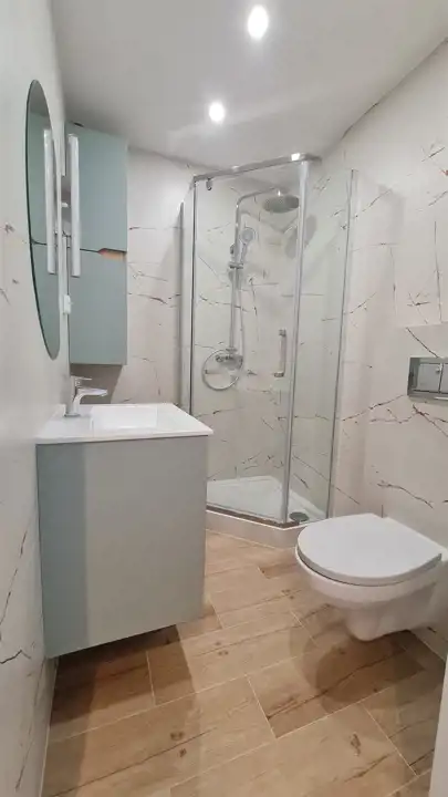 Łazienka wykończona w nowoczesnym stylu – komfortowa kabina prysznicowa oraz funkcjonalna zabudowa tworzą elegancką i spójną całość.