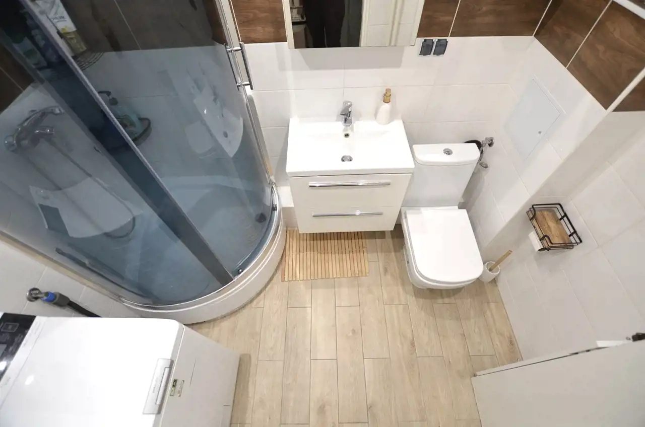 Łazienka cała w glazurze doposażona w kabinę prysznicową.