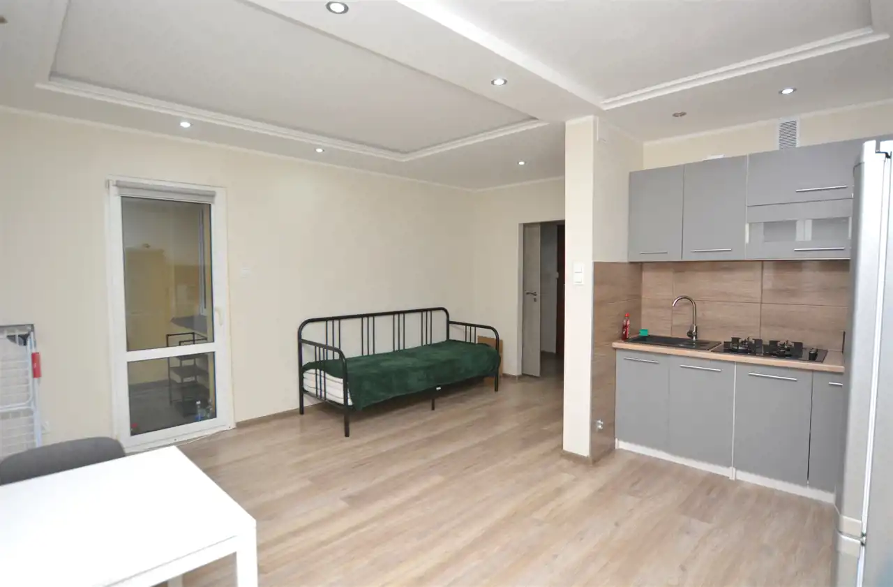 - jasna kuchnia z meblami w zabudowie wraz ze sprzętem AGD połączona z salonem z wyjściem na przestronny balkon