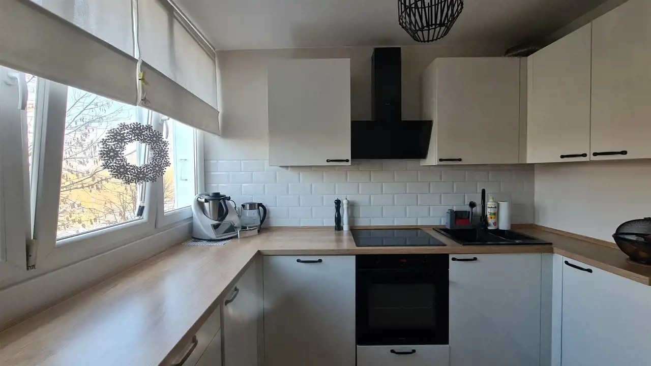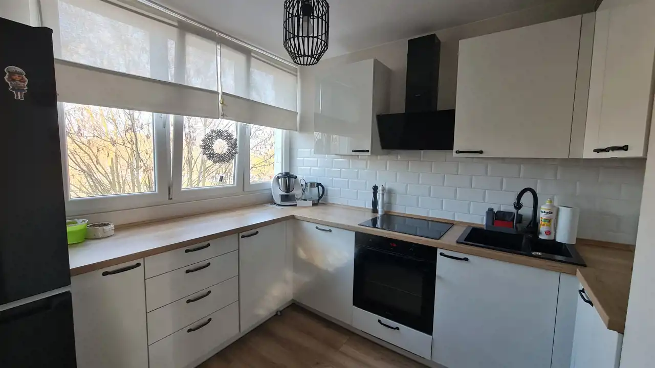 Okna PCV. Na ścianach gładź, na podłodze panele, wymienione instalacje, meble kuchenne w zabudowie ze sprzętem AGD, drzwi wymienione łącznie z ościeżnicami.