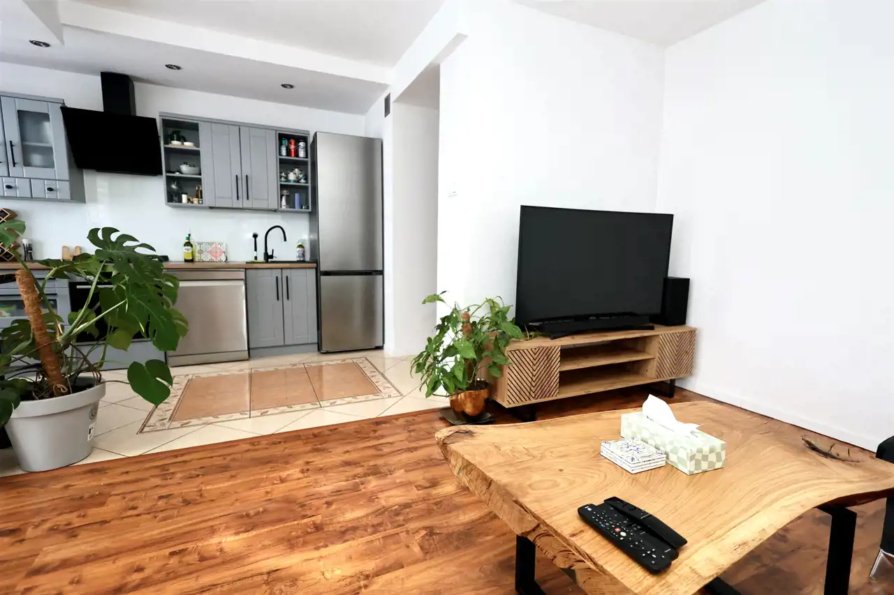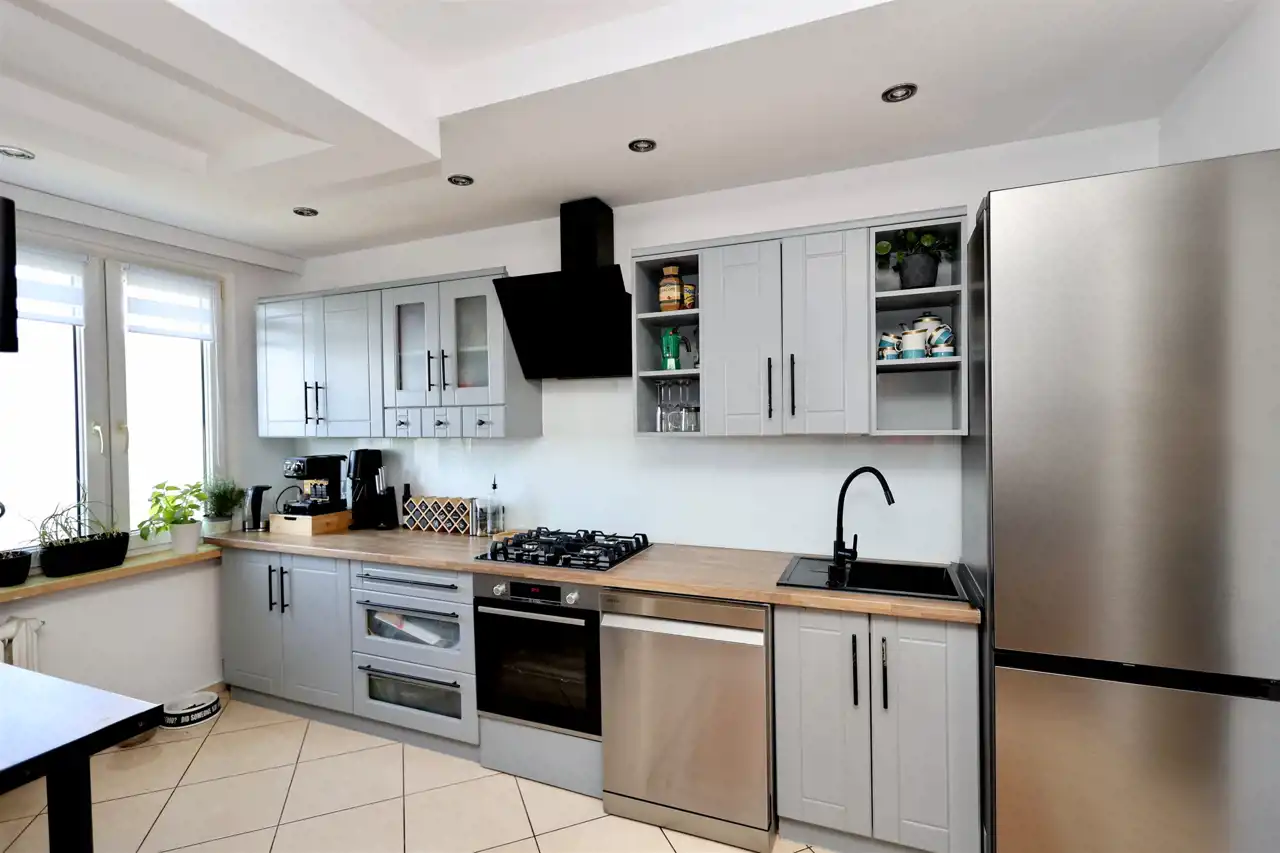 Kuchnia z zabudową meblową oraz sprzętem AGD (lodówka, piekarnik, płyta, okap), płynnie połączona z umeblowanym pokojem stołowym z wyjściem na balkon – idealne miejsce na poranną kawę!