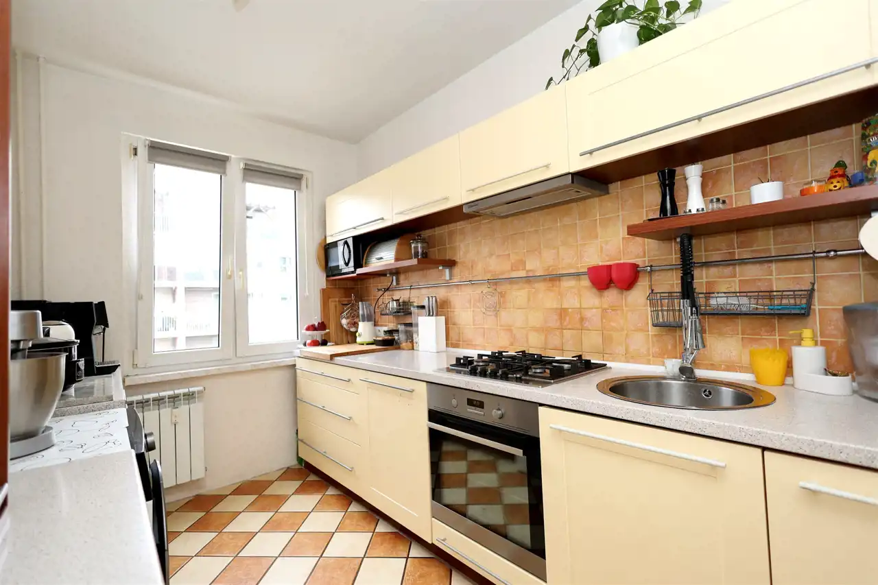 - Zabudowa w kuchni wraz z kompletnym wyposażeniem AGD - lodówko-zamrażarka, płyta gazowa, piekarnik, zmywarka, okap, zlew kompozytowy