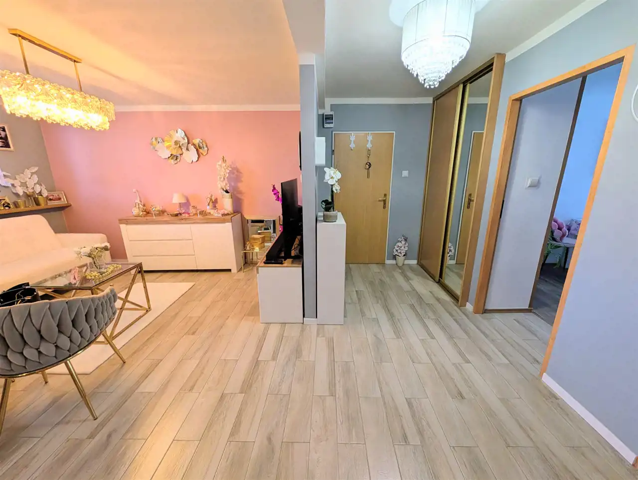 Mieszkanie jest bardzo przestronne ze względu na otwarty salon, częściowo kuchnię i duży przedpokój z szafą wnękową.