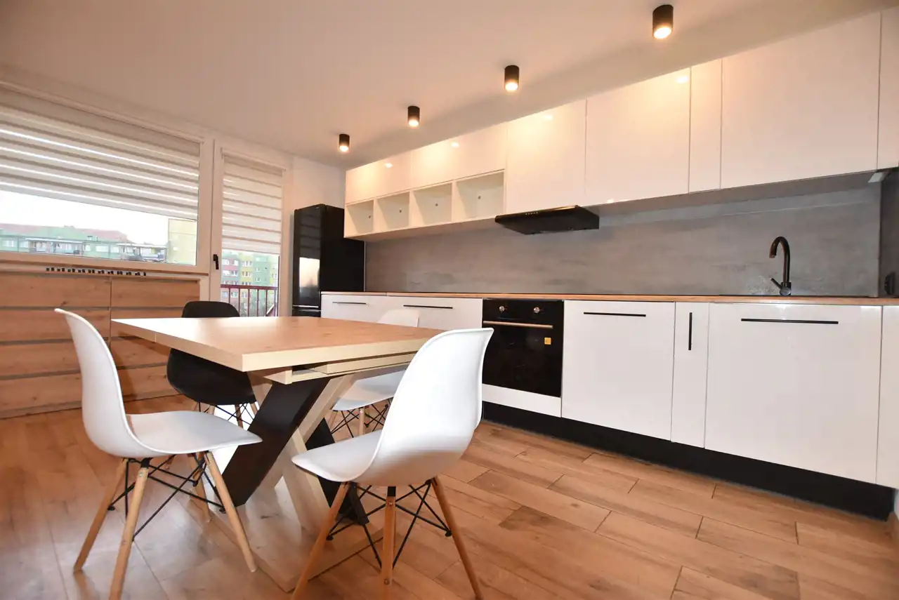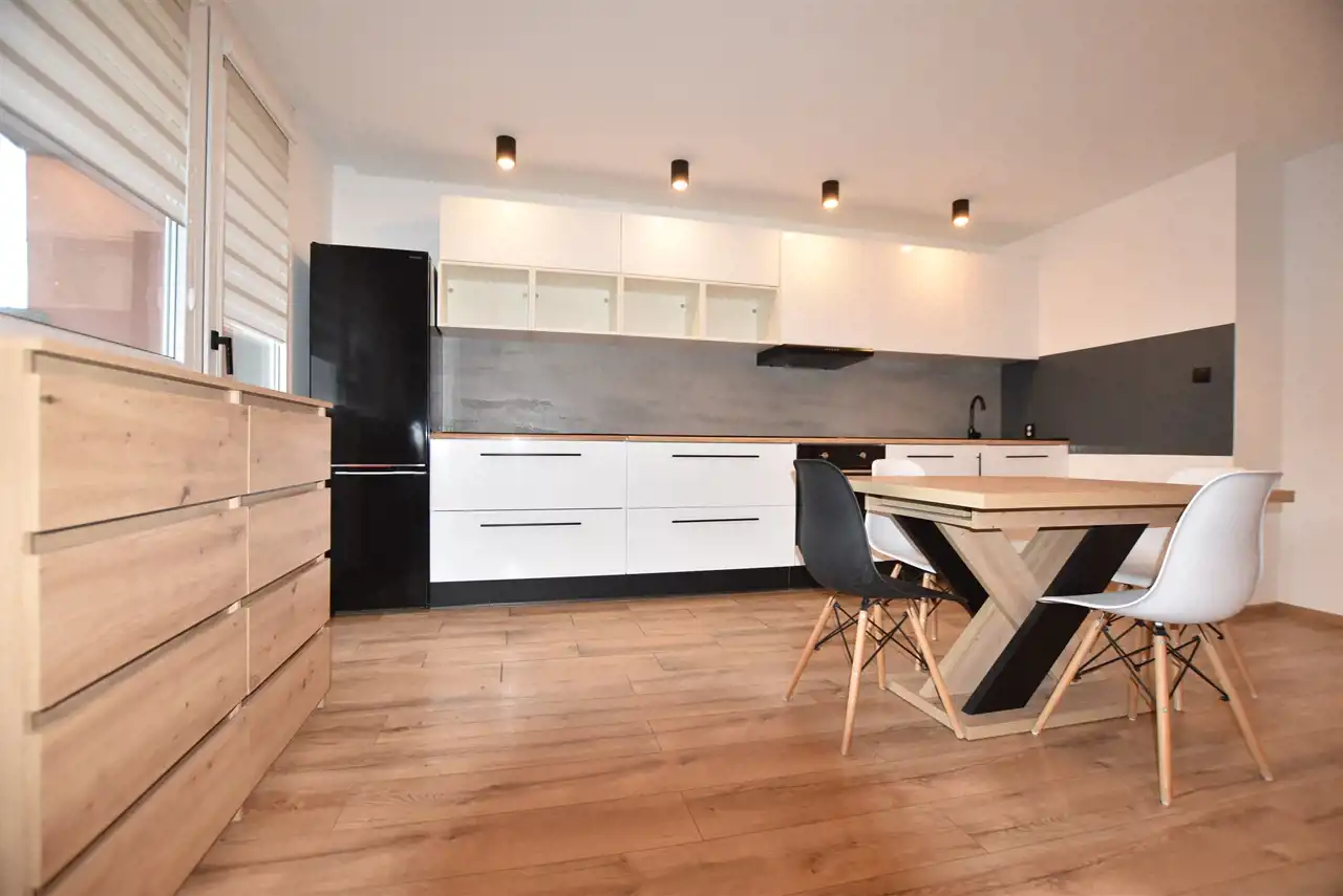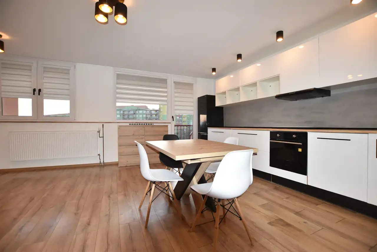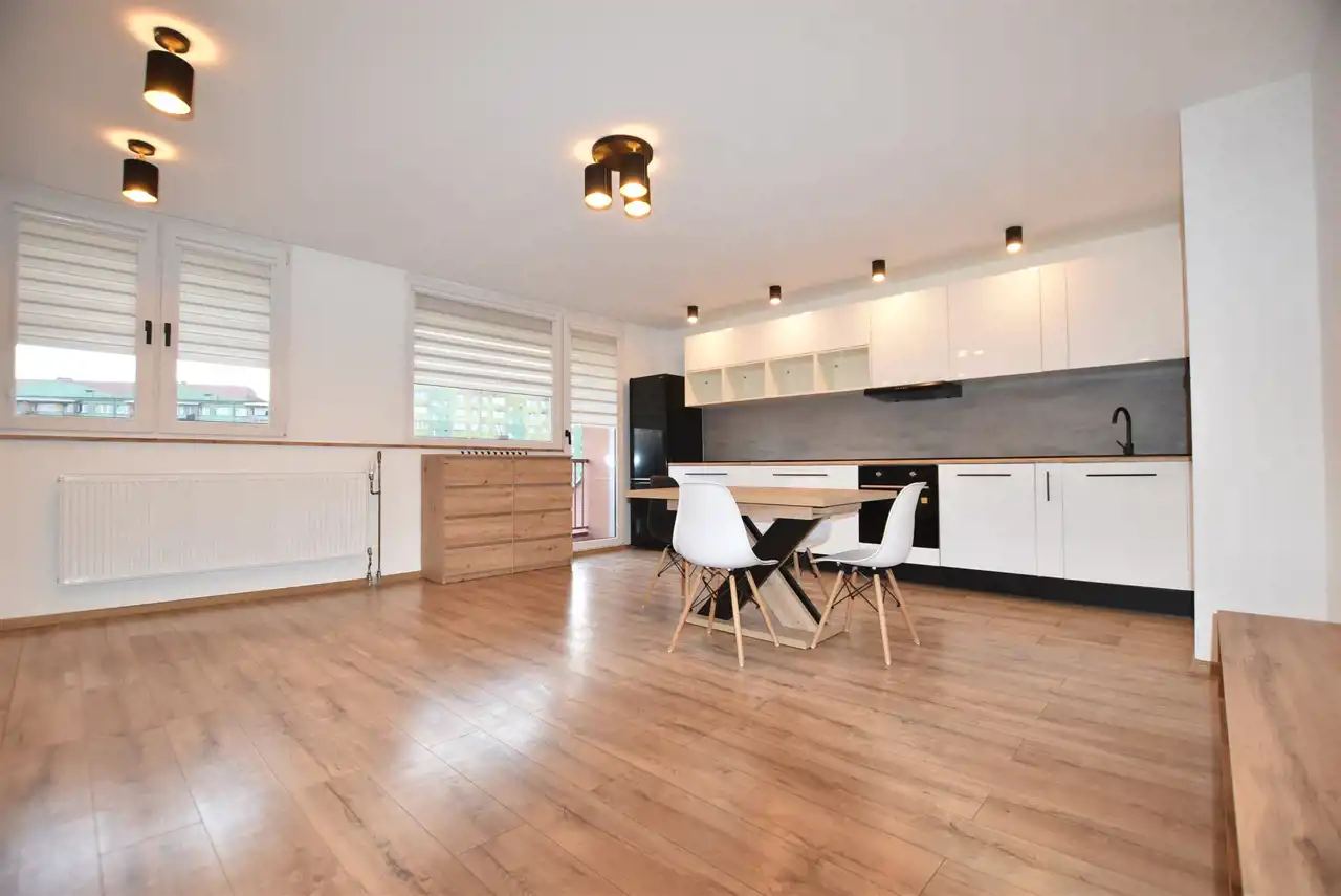 - przestronny POKÓJ DZIENNY połączony z KUCHNIĄ i JADALNIĄ z wyjściem na duży BALKON. Meble kuchenne w stałej zabudowie ze sprzętem tj. nowa płyta indukcyjna, piekarnik elektryczny, pochłaniacz pary, zmywarka i lodówka z zamrażarką.