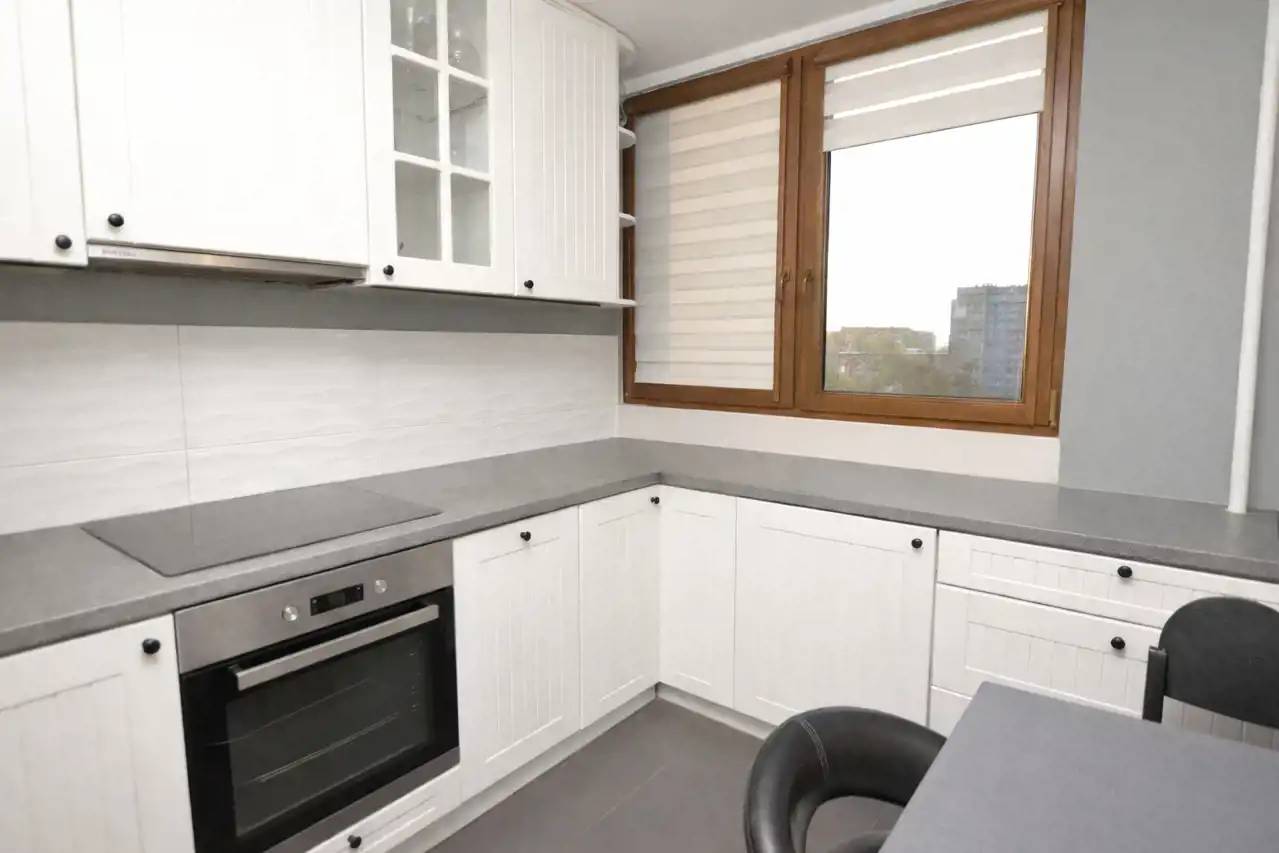 - jasna kuchnia wyposażona w nowoczesną zabudowę wraz ze sprzętem AGD ( zmywarka, płyta gazowa, piekarnik elektryczny, lodówko - zamrażarka, zabudowana pralka )
