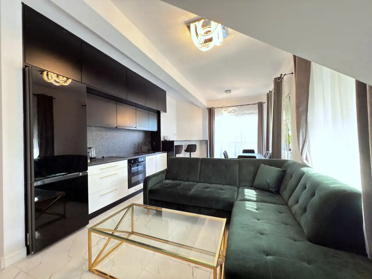 1. Przestronny salon z aneksem kuchennym i wyjściem na duży balkon – idealne miejsce na poranną kawę czy wieczorny relaks.