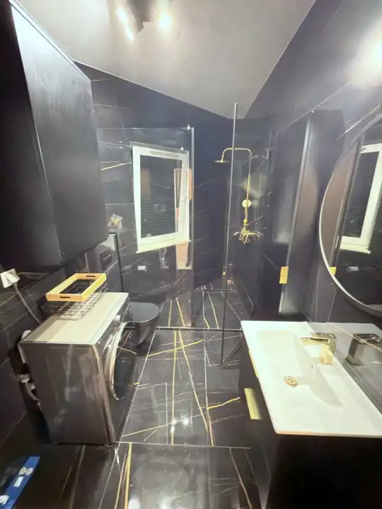 3. Nowoczesna łazienka z WC z ogrzewaniem podłogowym; prysznicem typu walk-in, podwieszaną armaturą, lustrem oraz pralka; dodatkowy grzejnik wiszący;