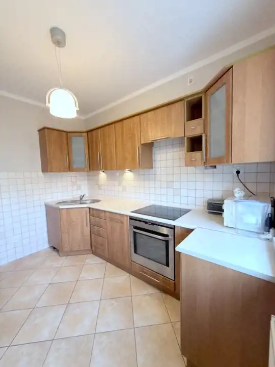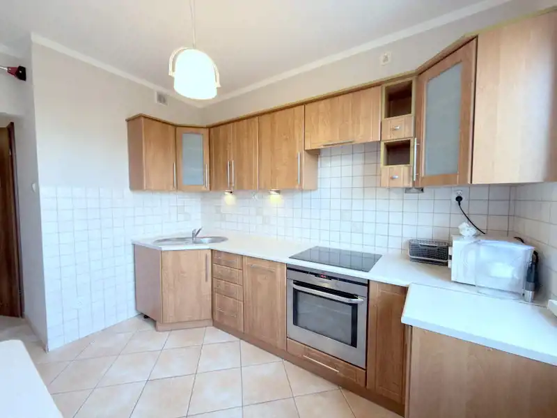 osobna kuchnia - meble kuchenne wraz ze sprzętem AGD: zmywarka, piekarnik elektryczny, płyta indukcyjna.