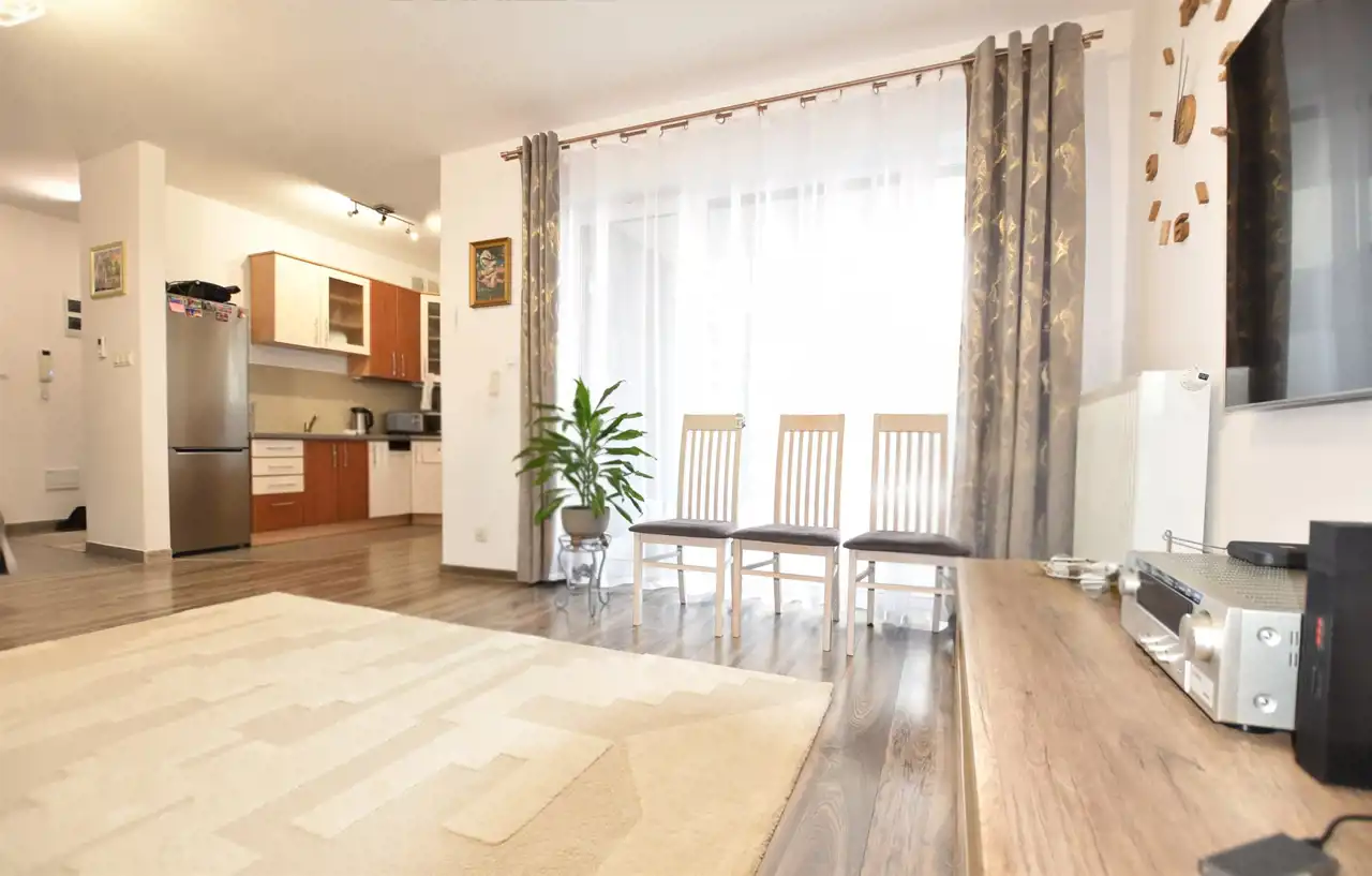 - pokój dzienny połączony z aneksem kuchennym pow. 27,65 m.kw (z obydwu pomieszczeń wyjście na taras pow. 18,17 m.kw). W kuchni meble ze sprzętem AGD tj: płyta indukcyjna, piekarnik elektryczny, zmywarka 60 cm;
