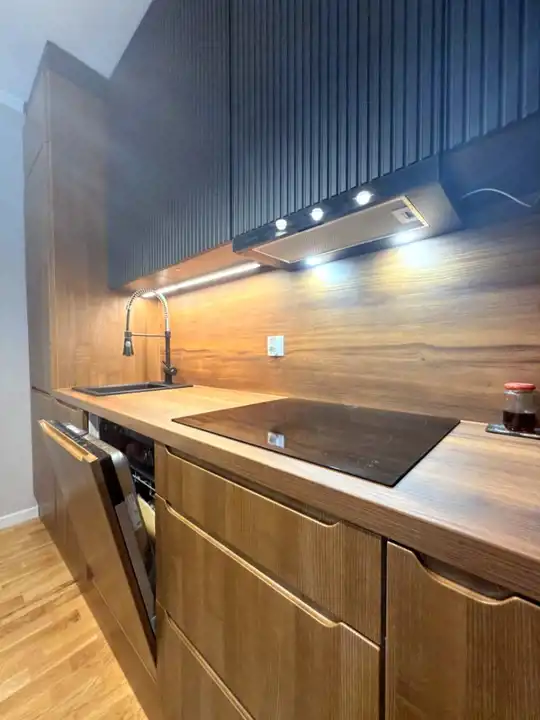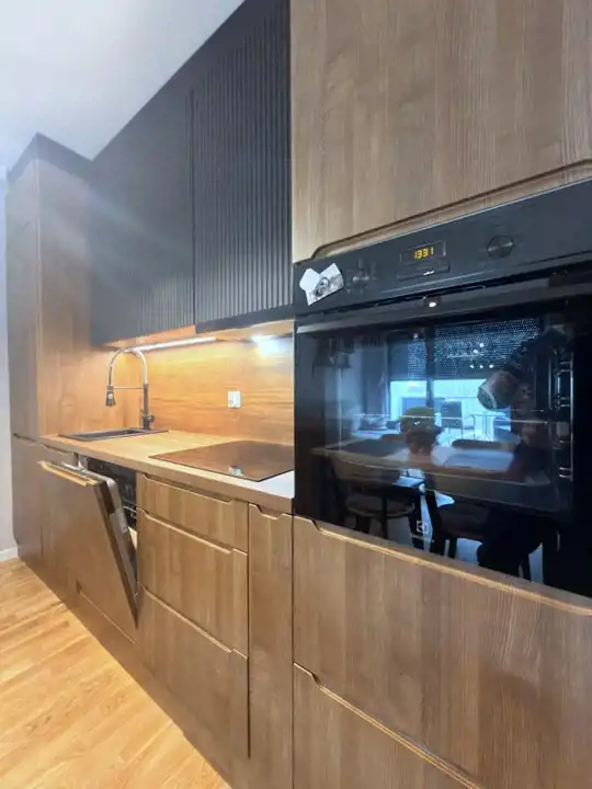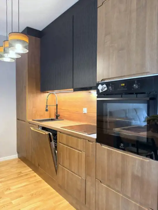 Kuchnia: meble w zabudowie pod sufit wraz z nowym sprzętem AGD: lodówka, płyta indukcyjna, piekarnik, okap, zmywarka;