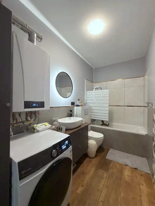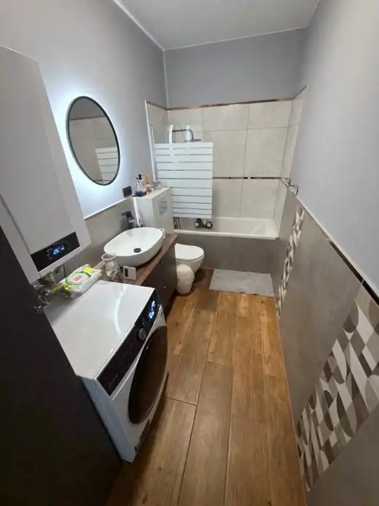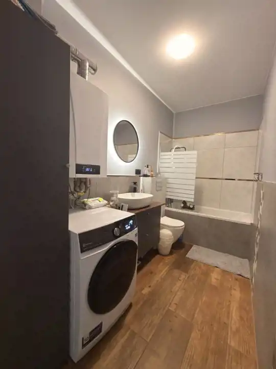 łazienka razem z WC - wanna z szybą prysznicową, pralka;