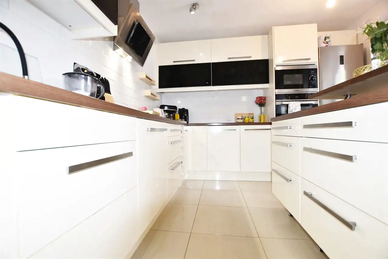 Kuchnię umeblowaną na wymiar z wyspą i sprzętem AGD: płyta indukcyjna, piekarnik elektryczny, okap, zmywarka 60 cm, mikrofalówka, lodówka