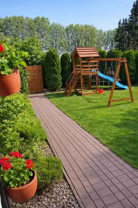 Zagospodarowany: wiata, plac zabaw, trampolina dla dzieci. Nasadzenia ozdobne (tuje) oraz krzewy owocowe (porzeczki, maliny, winogrona).