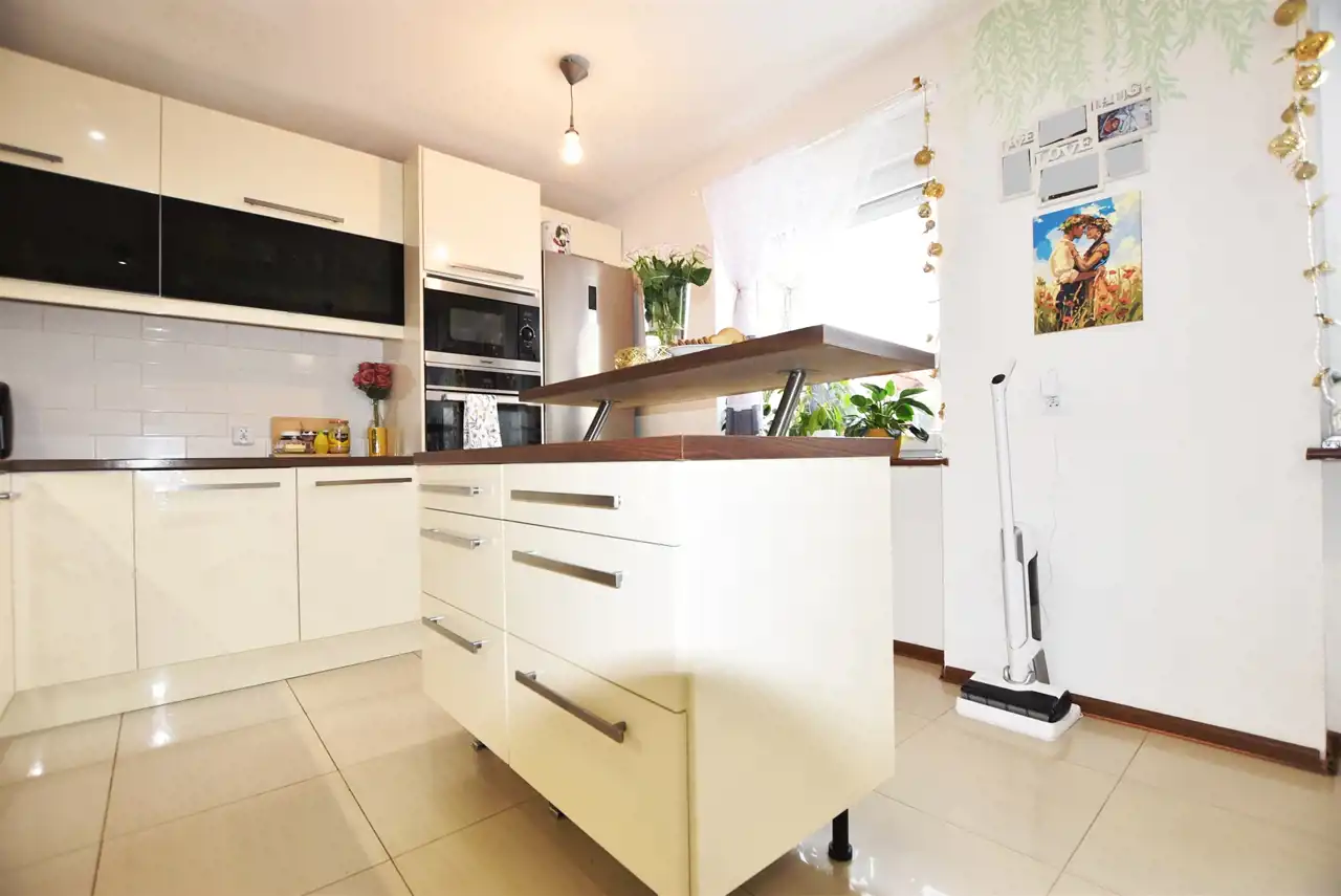 Kuchnię umeblowaną na wymiar z wyspą i sprzętem AGD: płyta indukcyjna, piekarnik elektryczny, okap, zmywarka 60 cm, mikrofalówka, lodówka