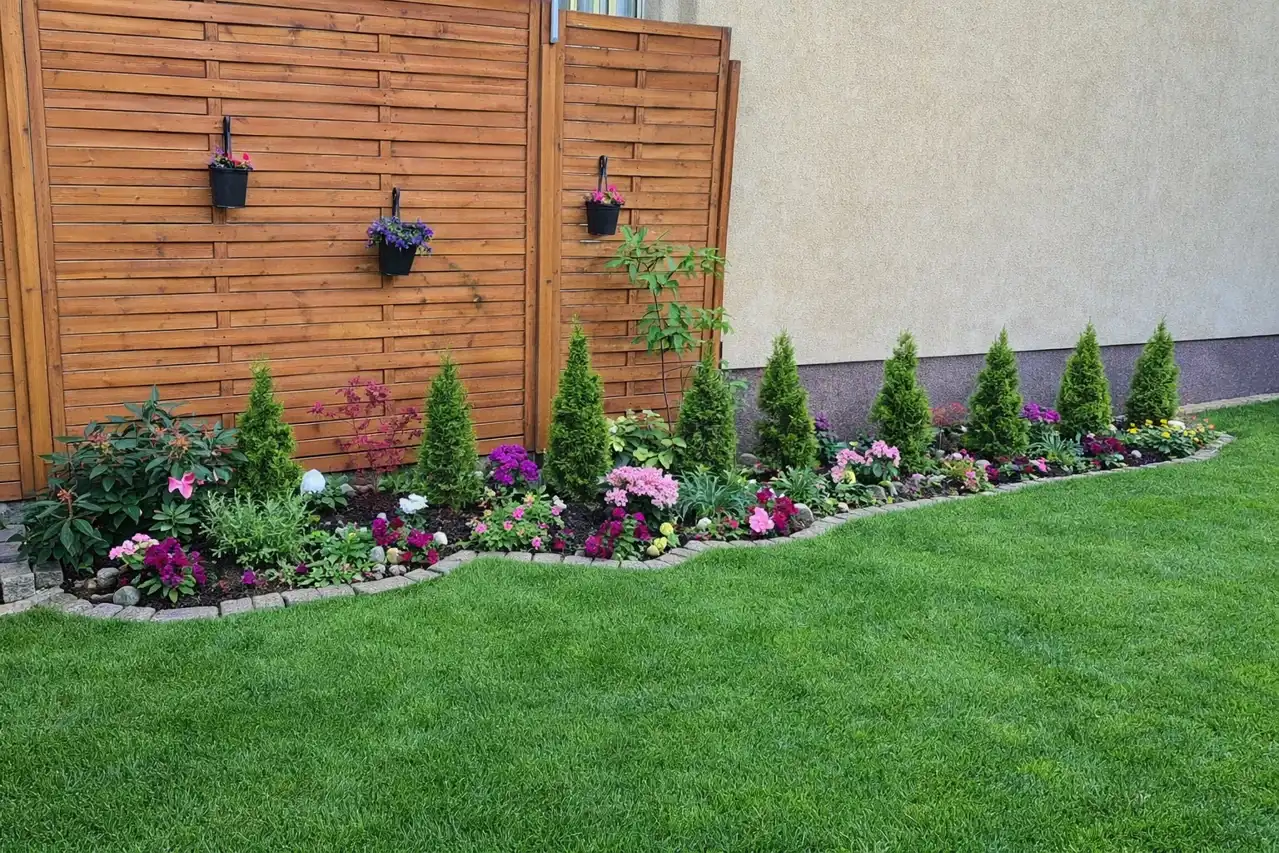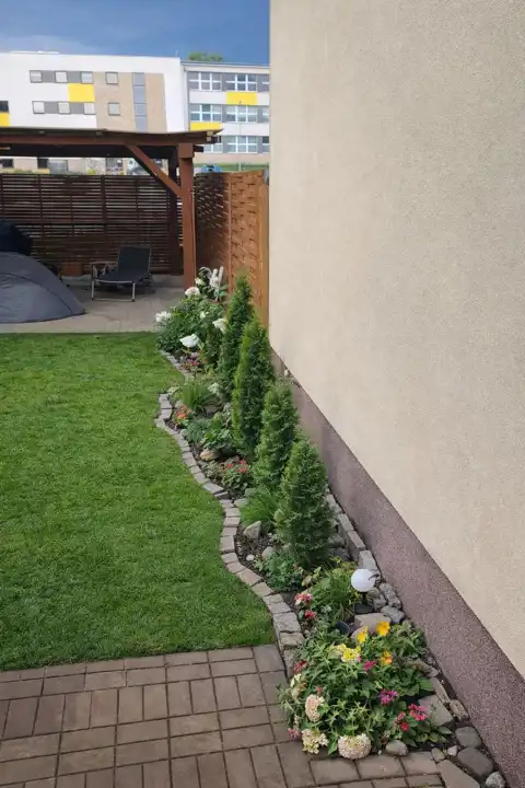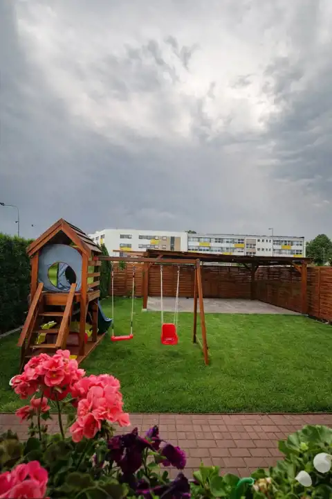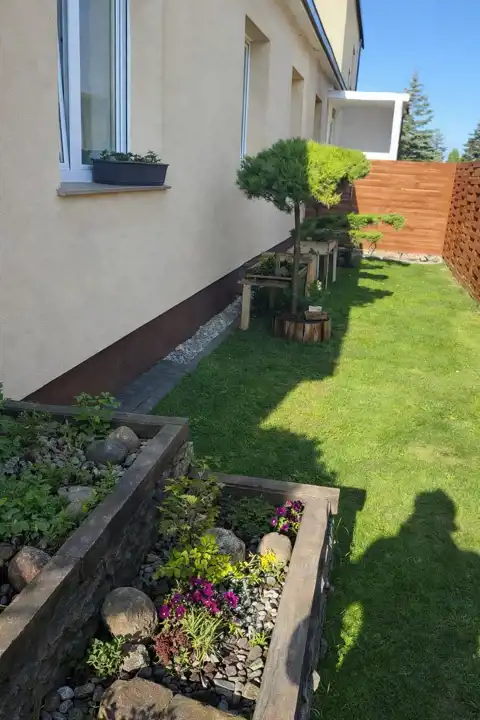 Zagospodarowany: wiata, plac zabaw, trampolina dla dzieci. Nasadzenia ozdobne (tuje) oraz krzewy owocowe (porzeczki, maliny, winogrona).