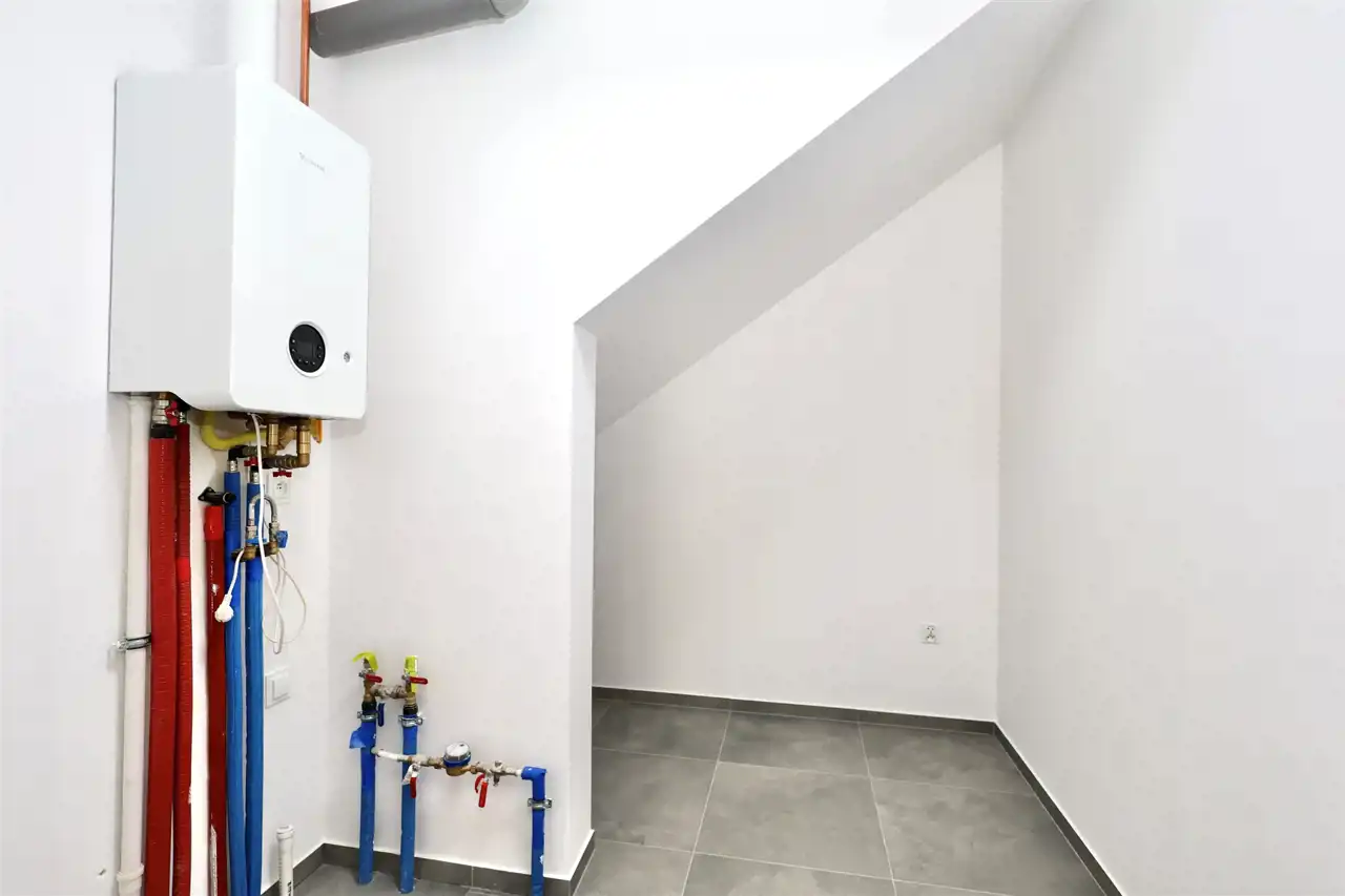 pomieszczenie techniczne z piecem 2-funkcyjnym i miejscem na pralkę i suszarkę