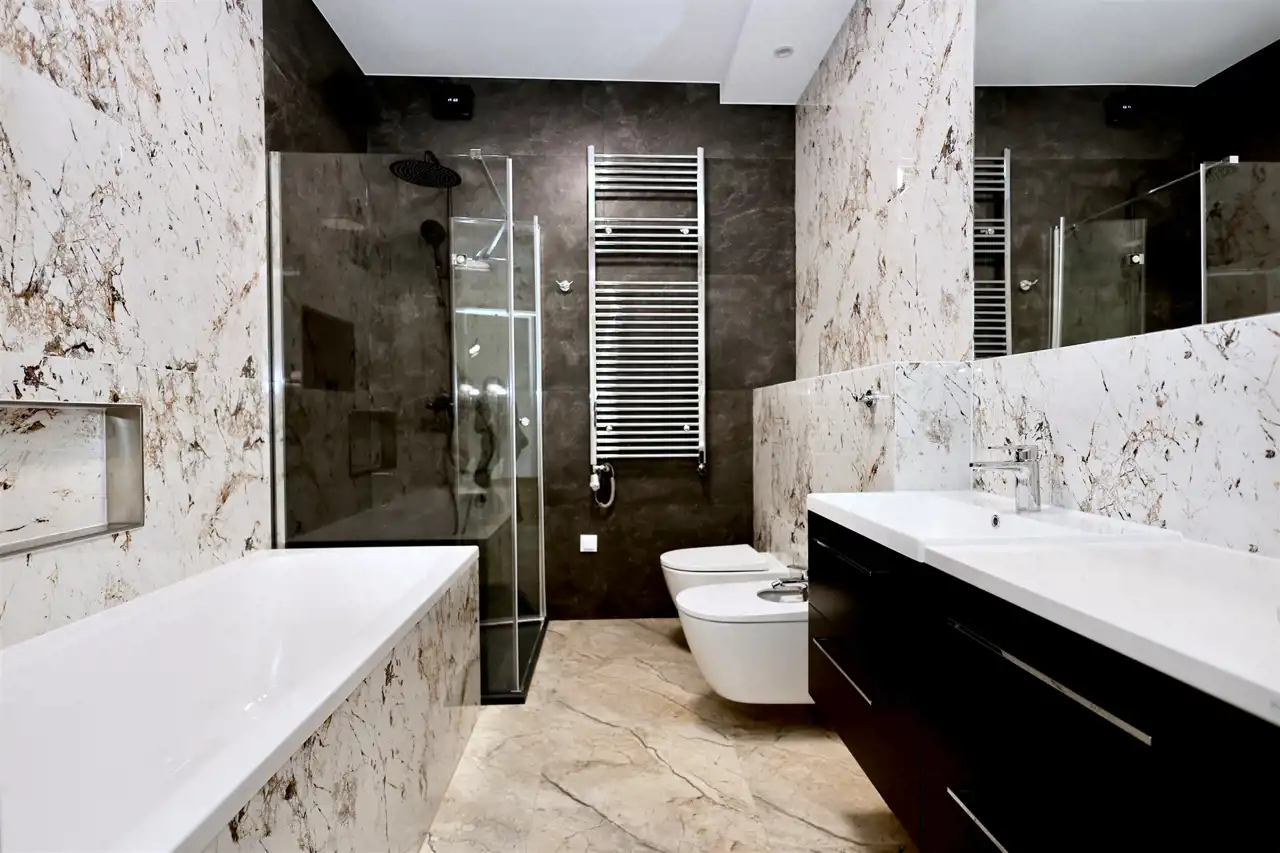 łazienka z wanną, prysznicem, toaletą, bidetem oraz dwoma umywalkami