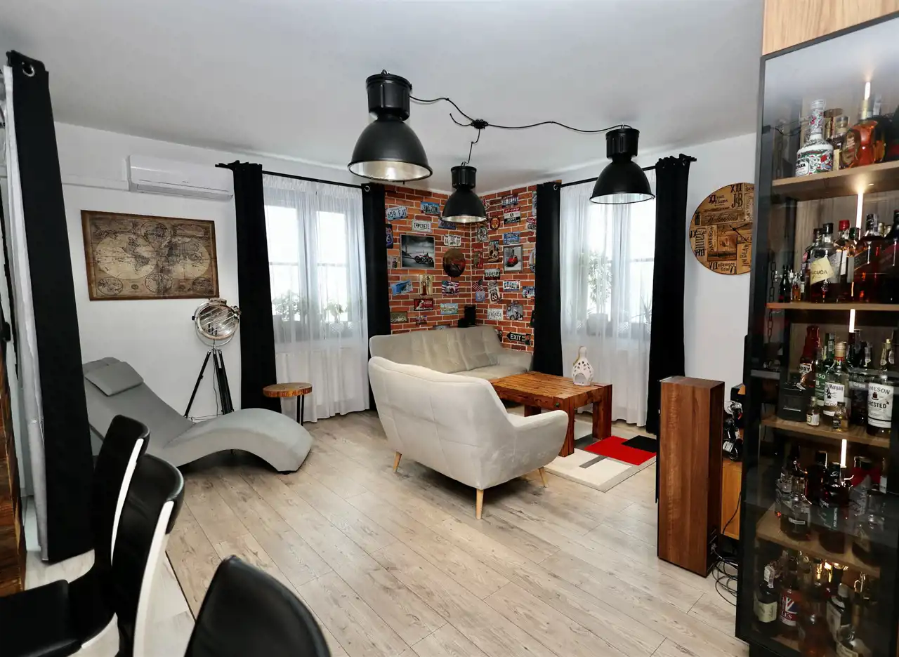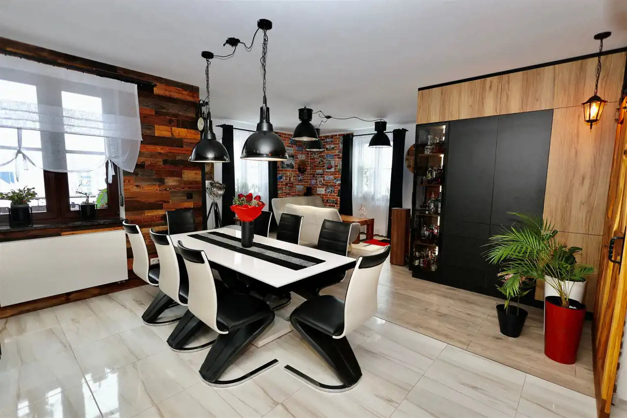 - meble kuchenne w zabudowie wraz z agd: nową płytą indukcyjną i nowym okapem, kuchenką mikrofalową, zmywarką (60 cm), piekarnikiem i chłodziarko-zamrażarką typu side by side, witryna w części salonowej,