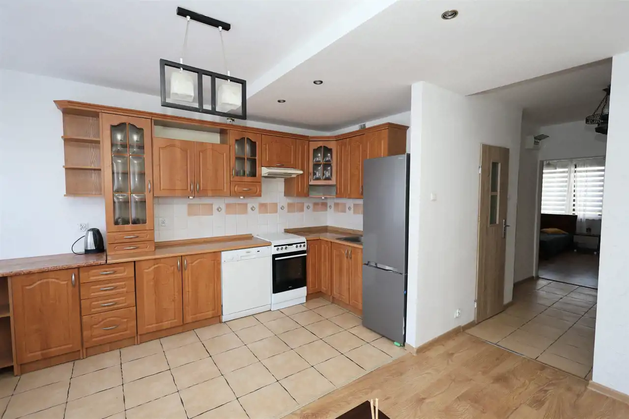Na wyposażeniu: kuchenka gazowo- elektryczna, okapem kuchenny, zmywarka, chłodziarko-zamrażarka i pralka.