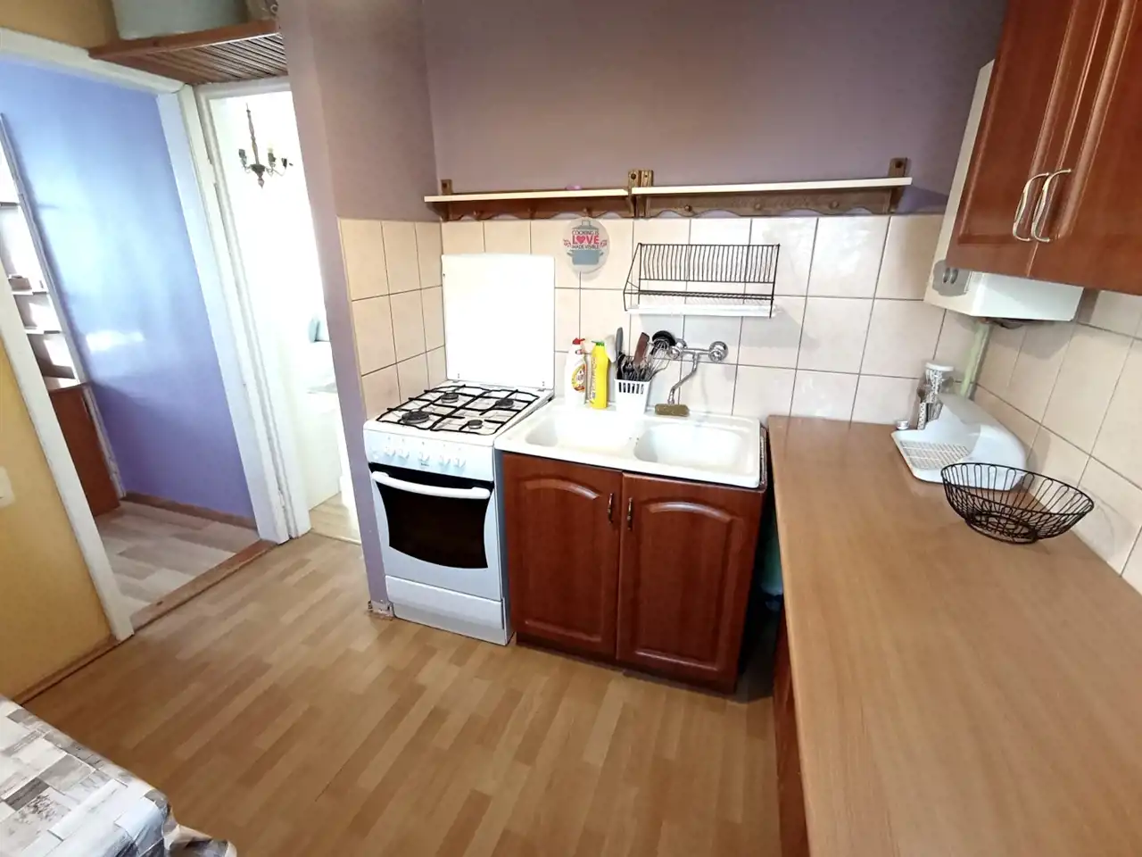 Mieszkanie składa się z dwóch pokoi - w tym jednego przejściowego, niewielkiej kuchni, łazienki z toaletą i przedpokoju.