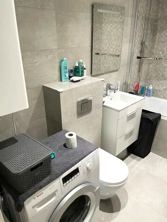 Mieszkanie jest kompletnie wyposażone w meble i sprzęt AGD ( tv szt. 2 ,pralka, zmywarka, kuchenka,piekarnik, lodówka,okap kuchenny). W przedpokoju znajduje się duża szafa w zabudowie. Do mieszkania przynależy balkon o pow. 7m2 oraz do dyspozycji wynajmującego jest wózkownia (dojazd windą).