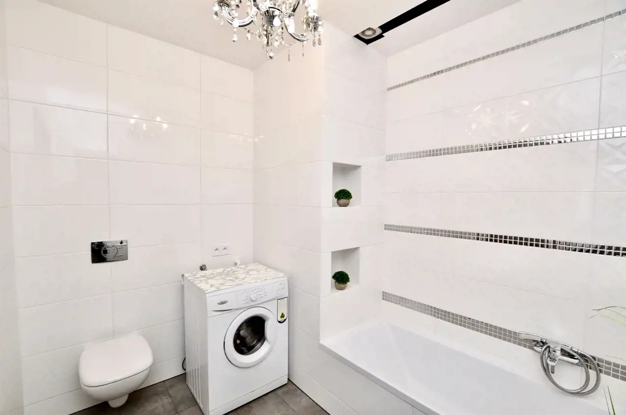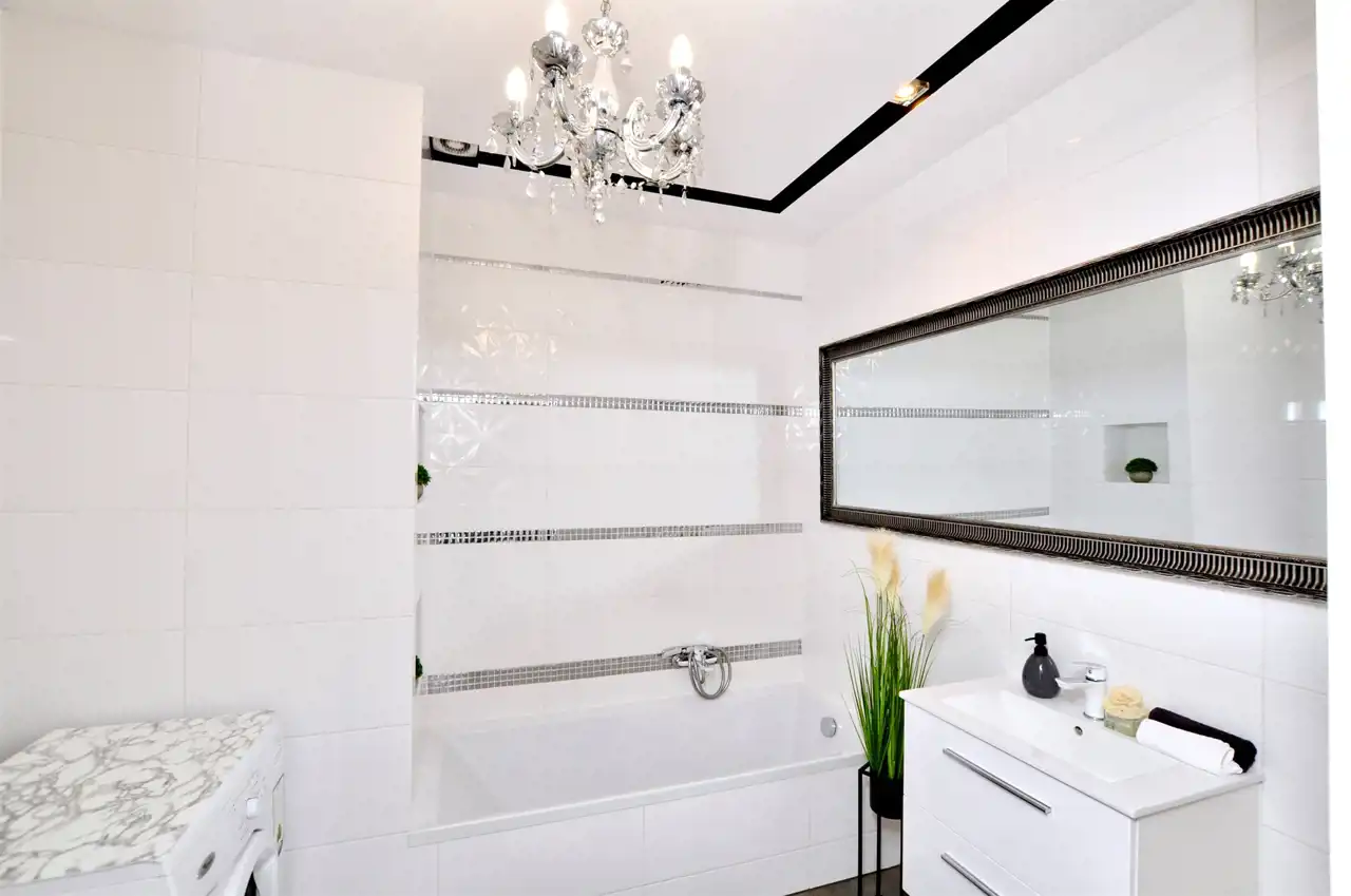 - przestronnej łazienki z wanną i WC wykończonej i wyposażonej w stylu glamour