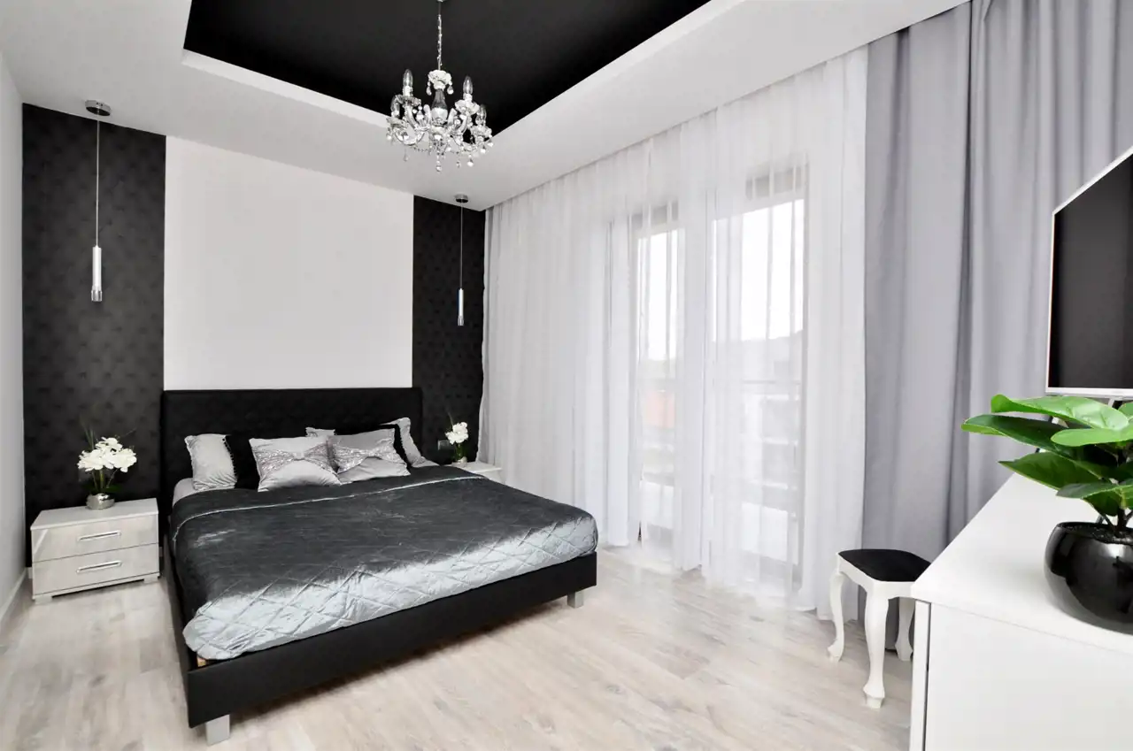 - sypialni z wyjściem na balkon - wyposażonej w łóżko małżeńskie oraz zestaw mebli (komoda + 2 stoliki nocne)