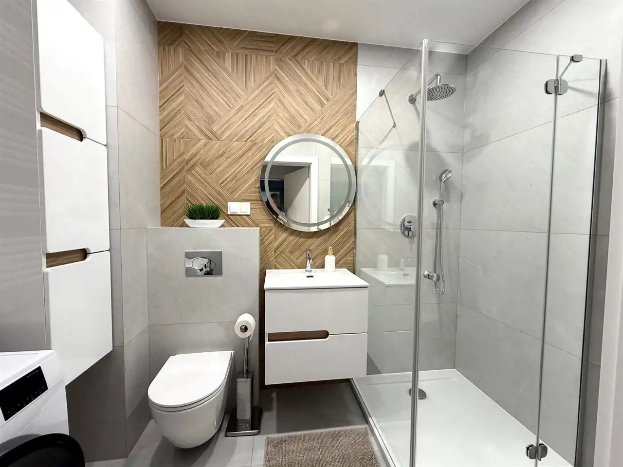 - łazienka z WC , prysznicem, umywalką, szafkami oraz pralką