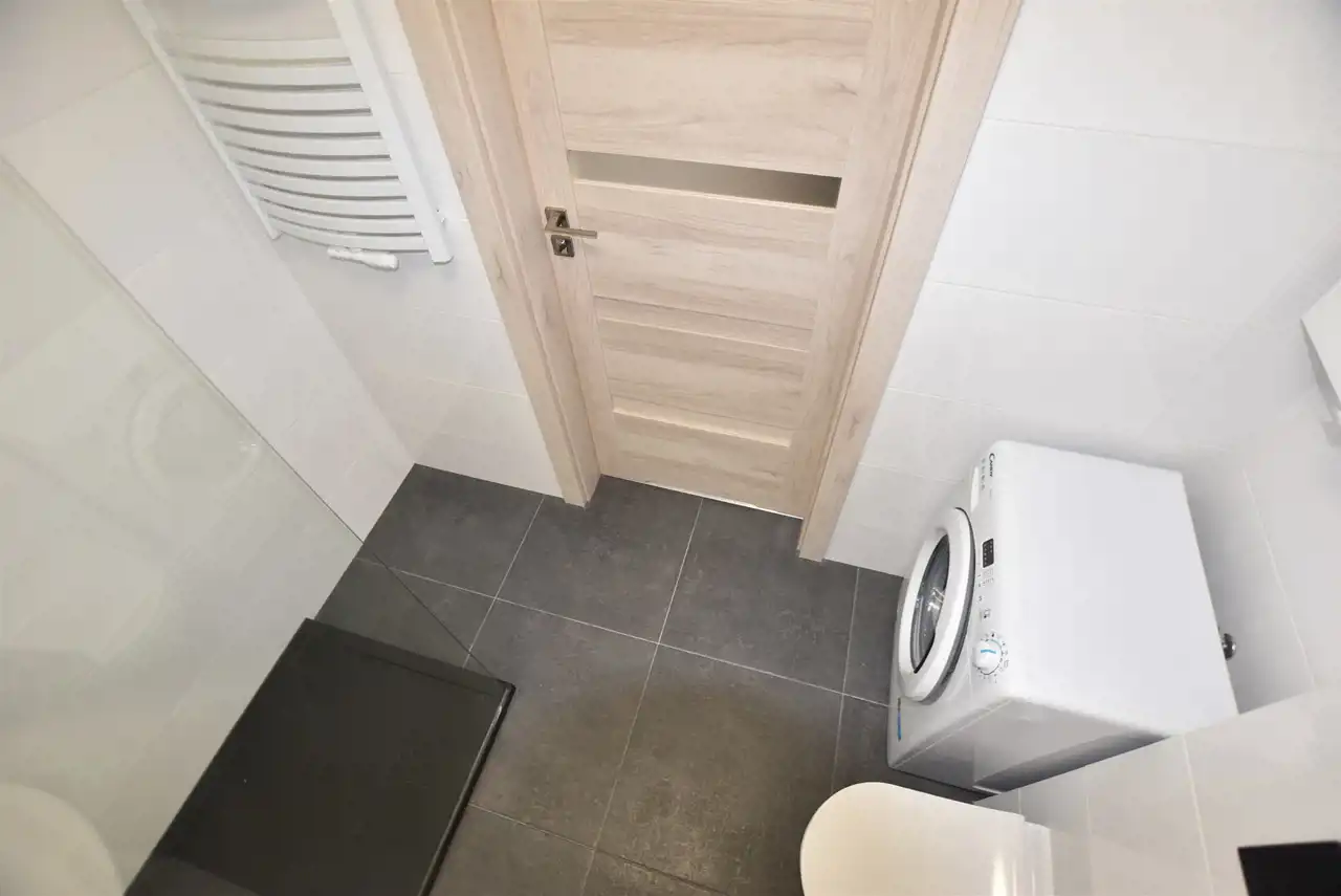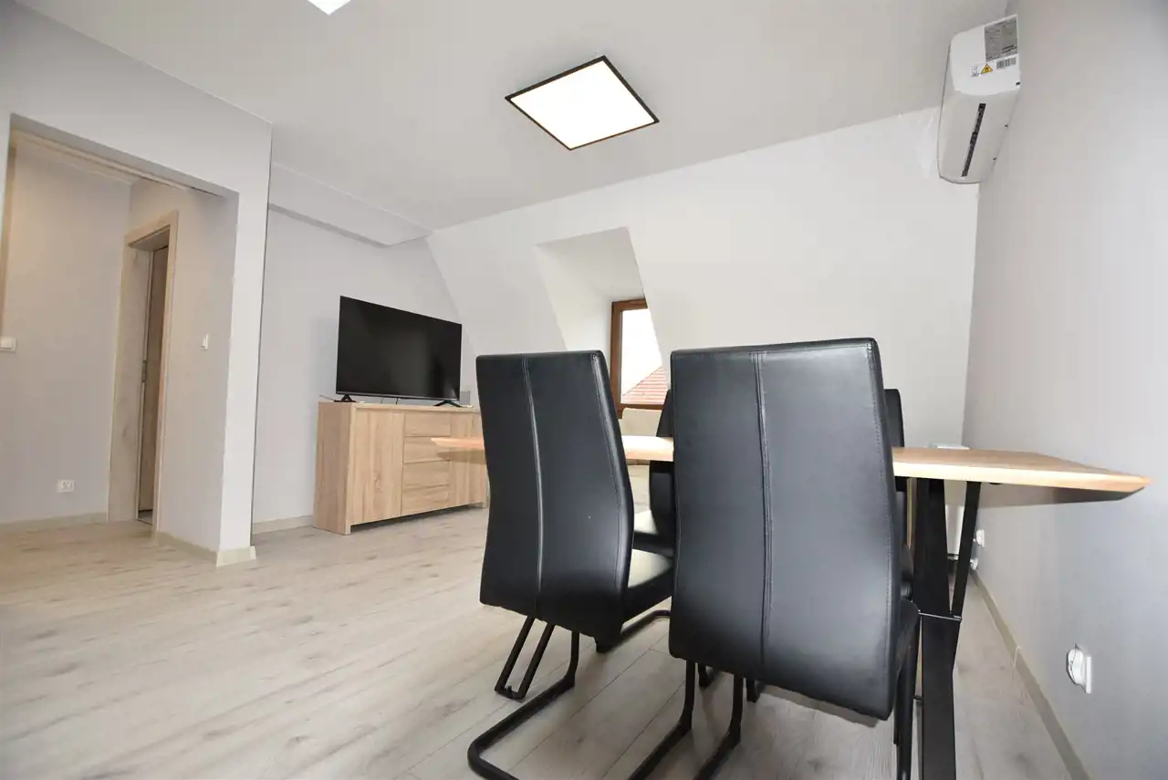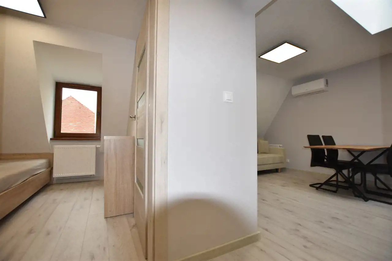 Do dyspozycji Najemcy w pokoju dziennym klimatyzacja, w kuchni meble kuchenne ze sprzętem AGD tj. płyta indukcyjna, piekarnik elektryczny, zmywarka. W nowoczesnej glazurze łazienka z prysznicem. Pokój dzienny i kuchnia bardzo dobrze doświetlony światłem dziennym za pomocą świetlika umieszczonego w suficie.