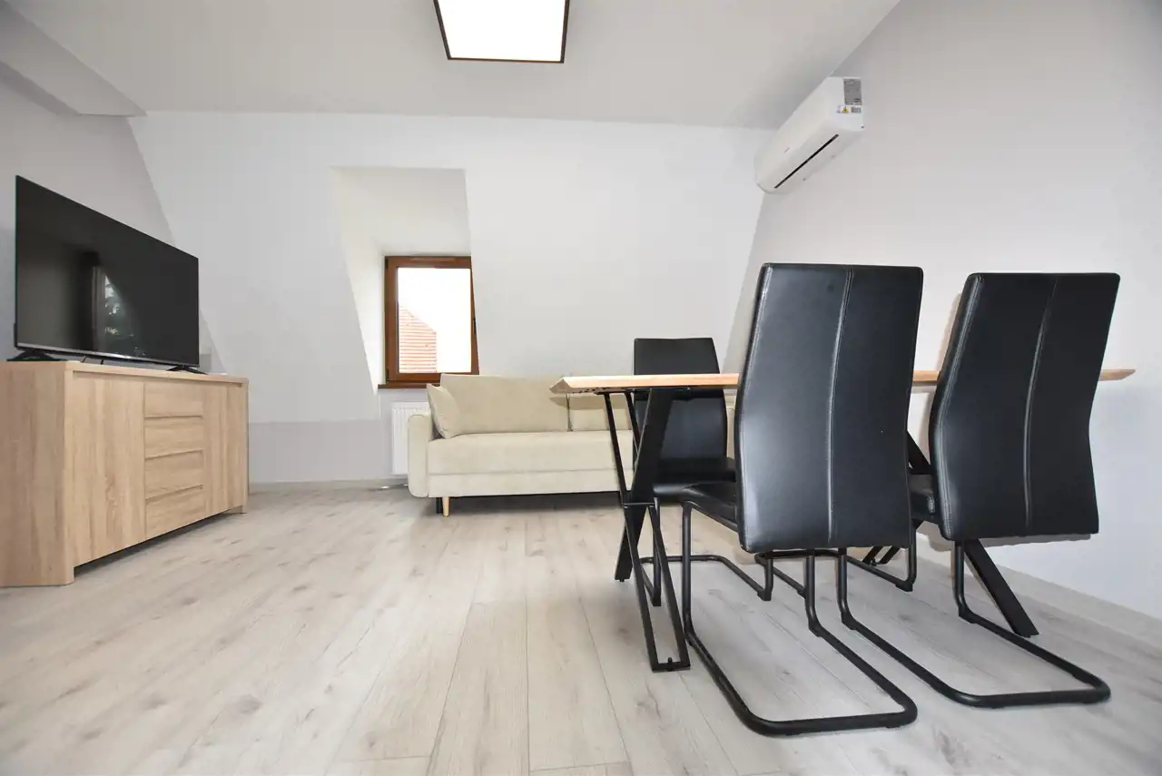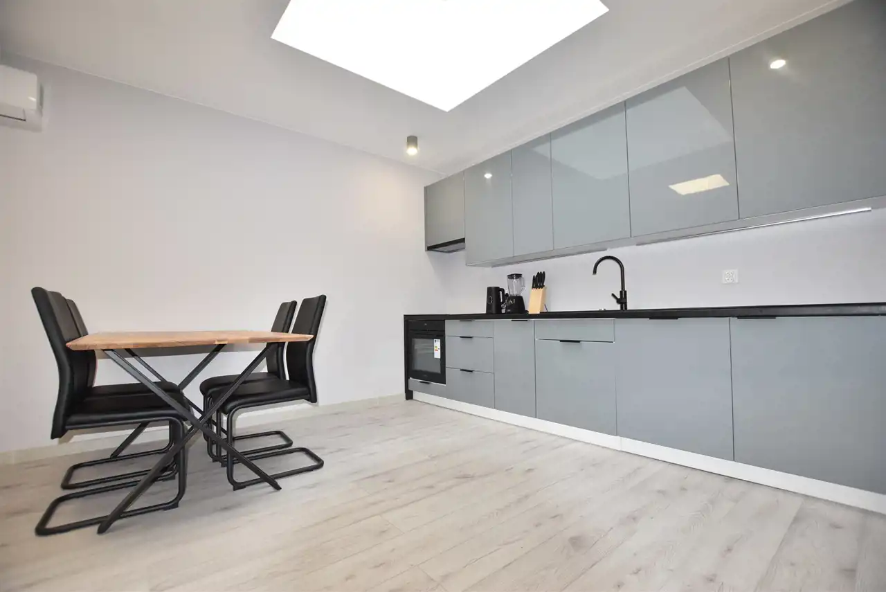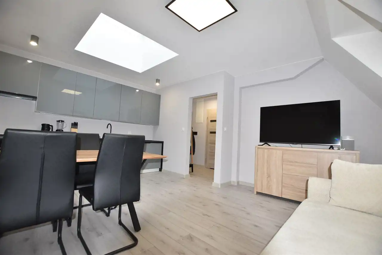 Do dyspozycji Najemcy w pokoju dziennym klimatyzacja, w kuchni meble kuchenne ze sprzętem AGD tj. płyta indukcyjna, piekarnik elektryczny, zmywarka. W nowoczesnej glazurze łazienka z prysznicem. Pokój dzienny i kuchnia bardzo dobrze doświetlony światłem dziennym za pomocą świetlika umieszczonego w suficie.