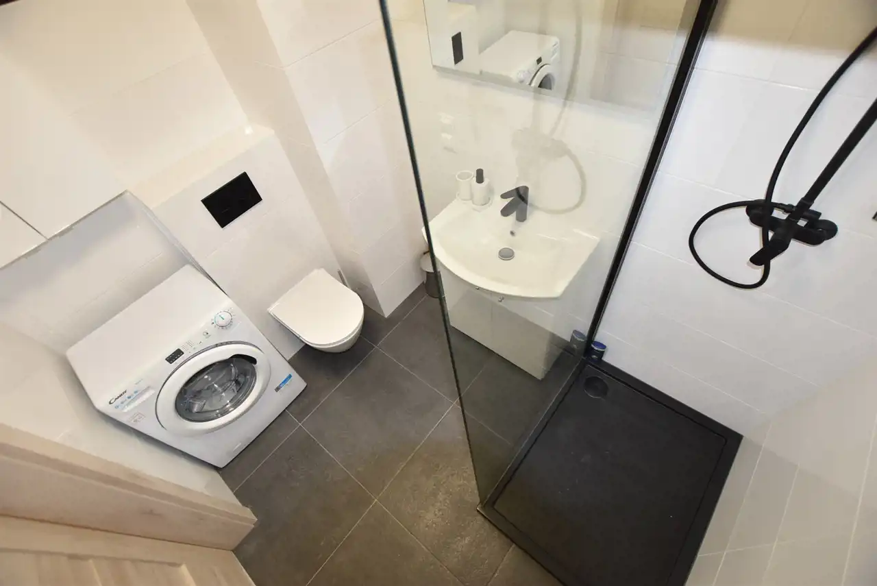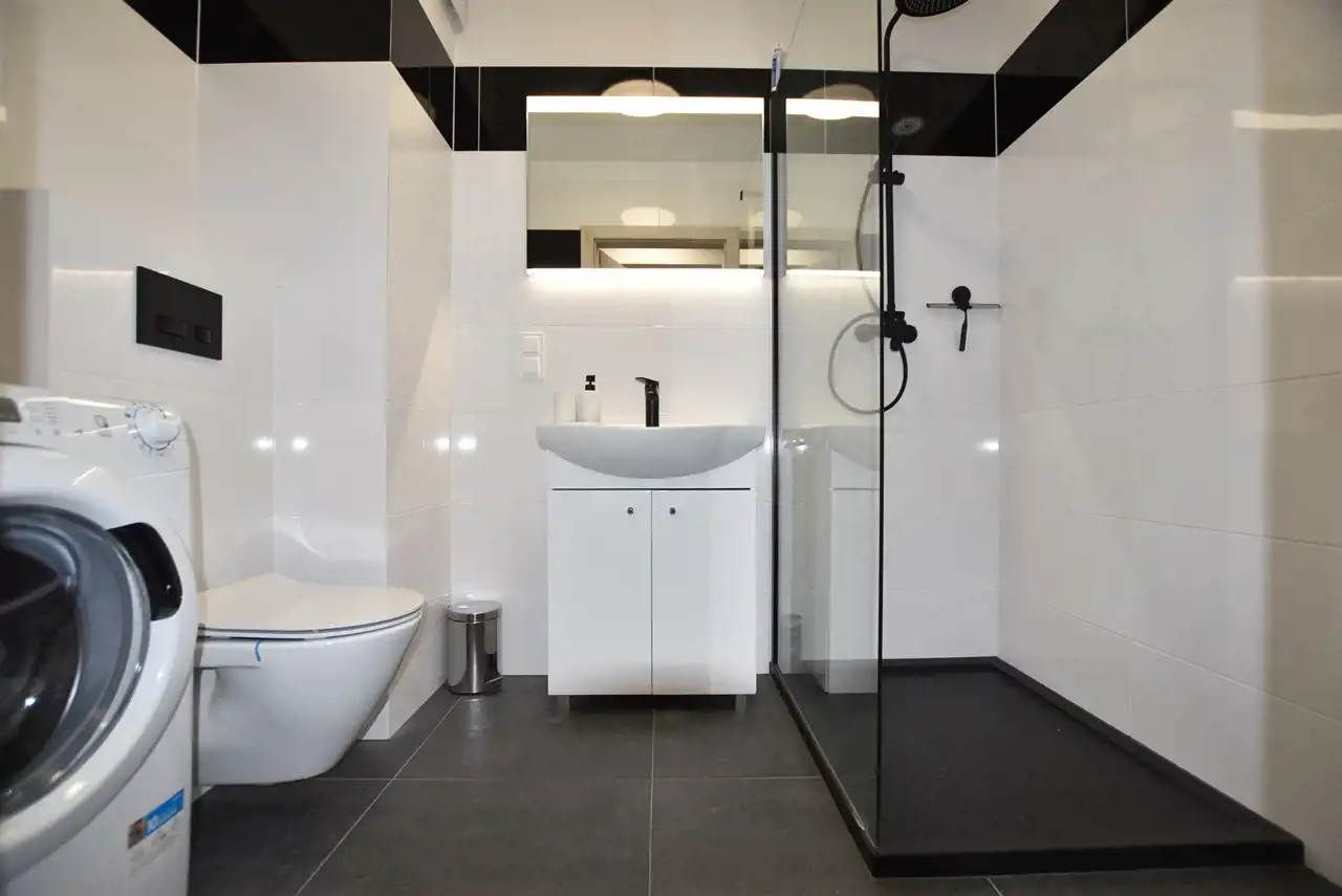 - łazienkę w nowoczesnej glazurze razem z WC,