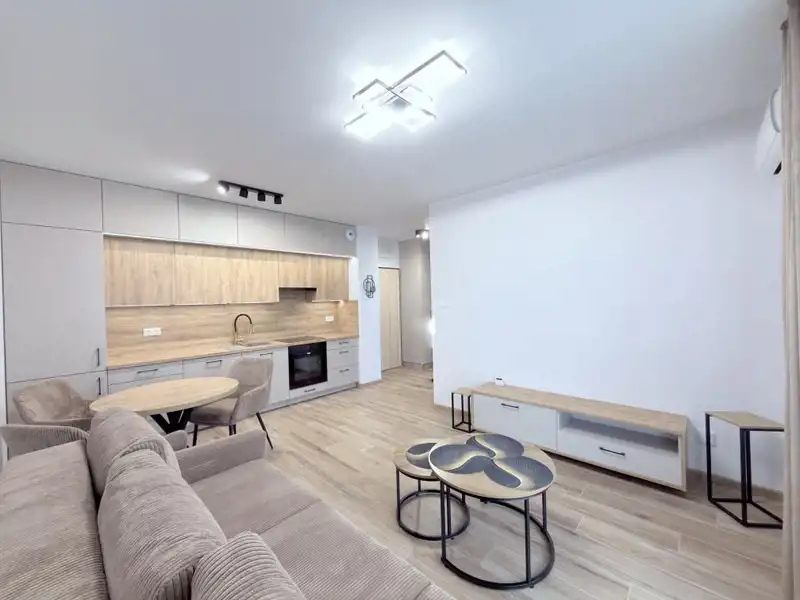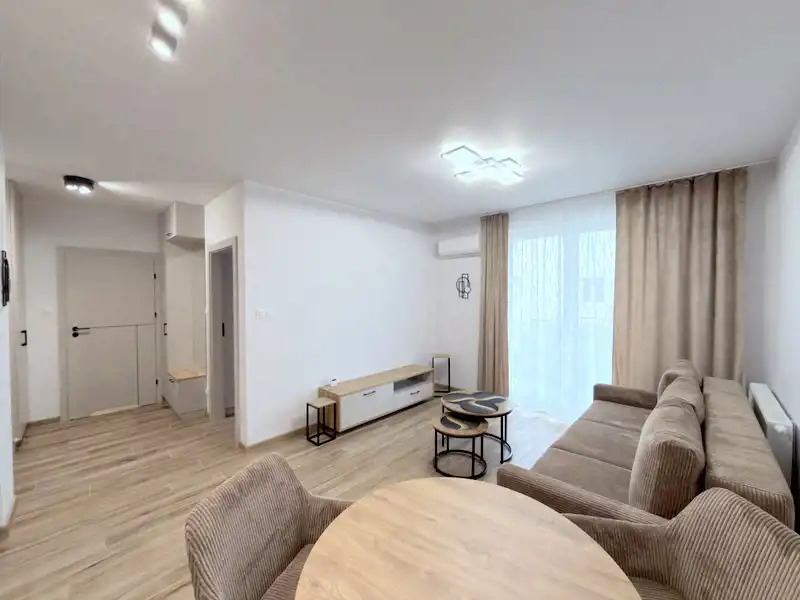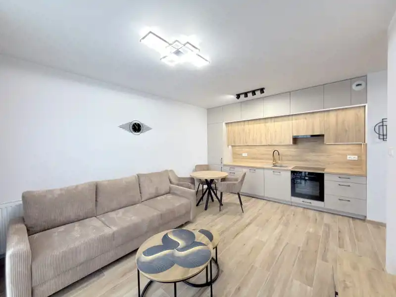 Salon z aneksem kuchennym - salon z wyjściem na balkon - sofa rozkładana z funkcją spania, stół jadalniany z krzesłami, stolik kawowy, szafka pod TV.