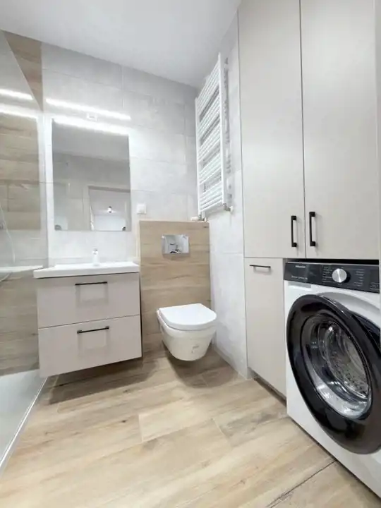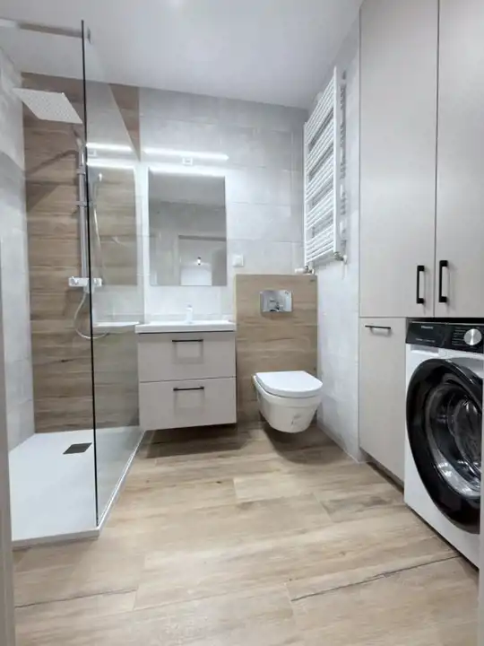Łazienka z wc – prysznic, umywalka, pralka, meble w zabudowie;