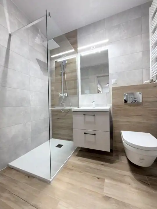 Na ścianach gładzie, podłogi w glazurze, oświetlenie ledowe;