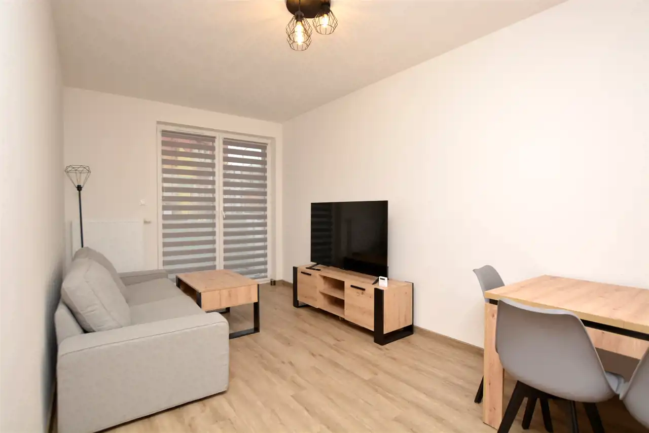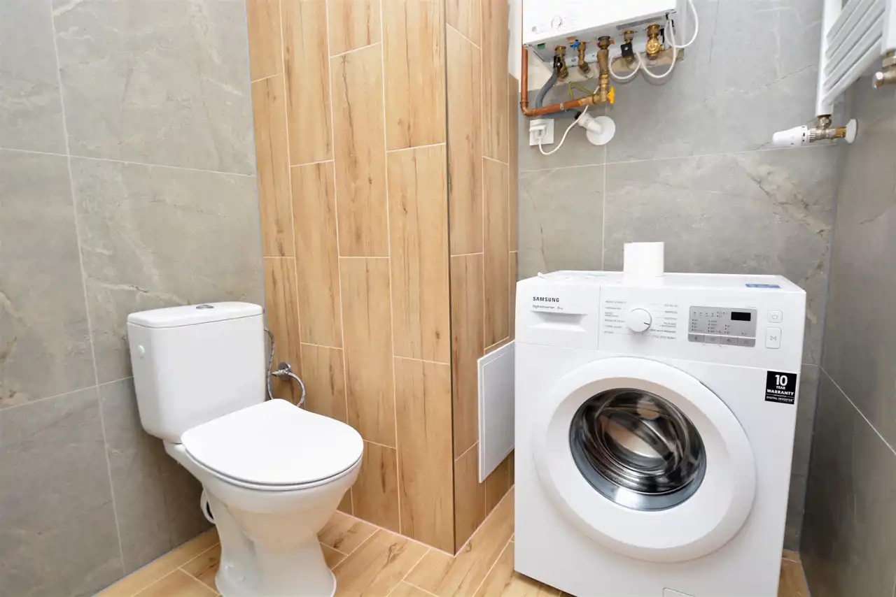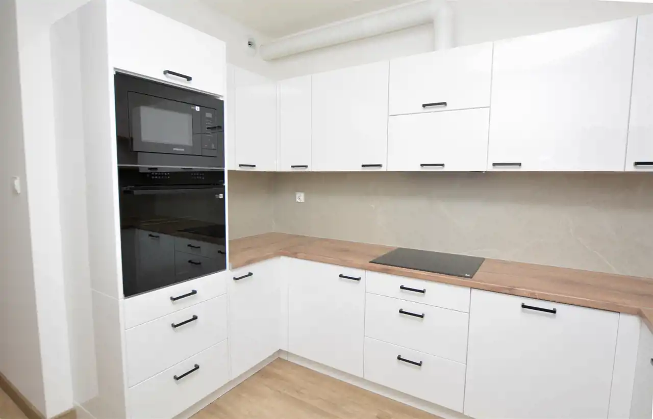 Mieszkanie umeblowane i wyposażone w niezbędne AGD: pralka, zmywarka, płyta indukcyjna, piekarnik, mikrofalówka w zabudowie, chłodziarko-zamrażarka.