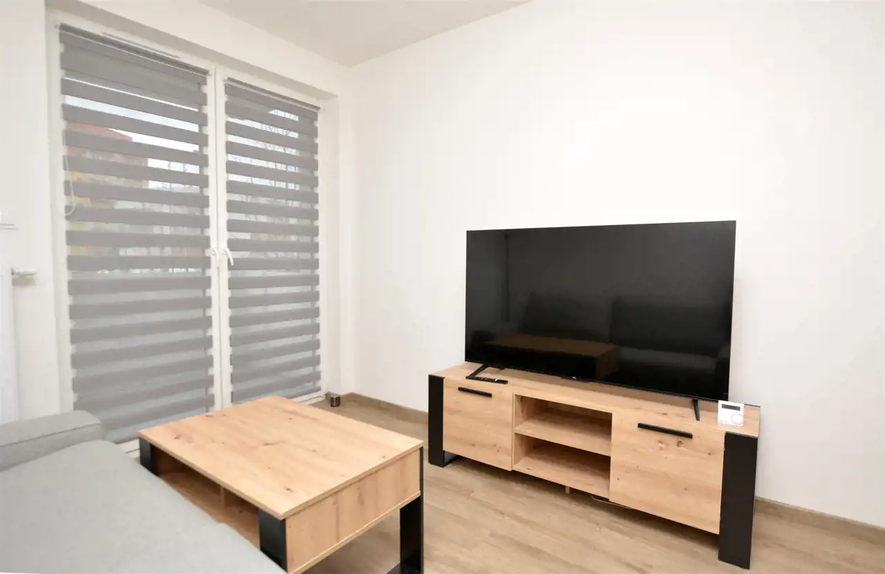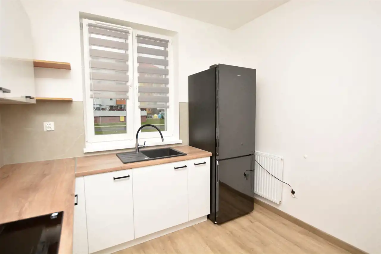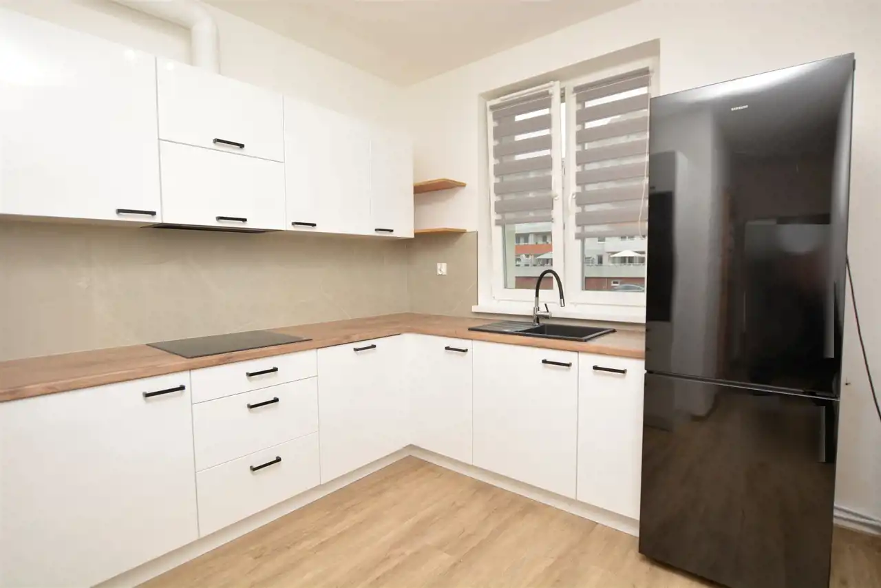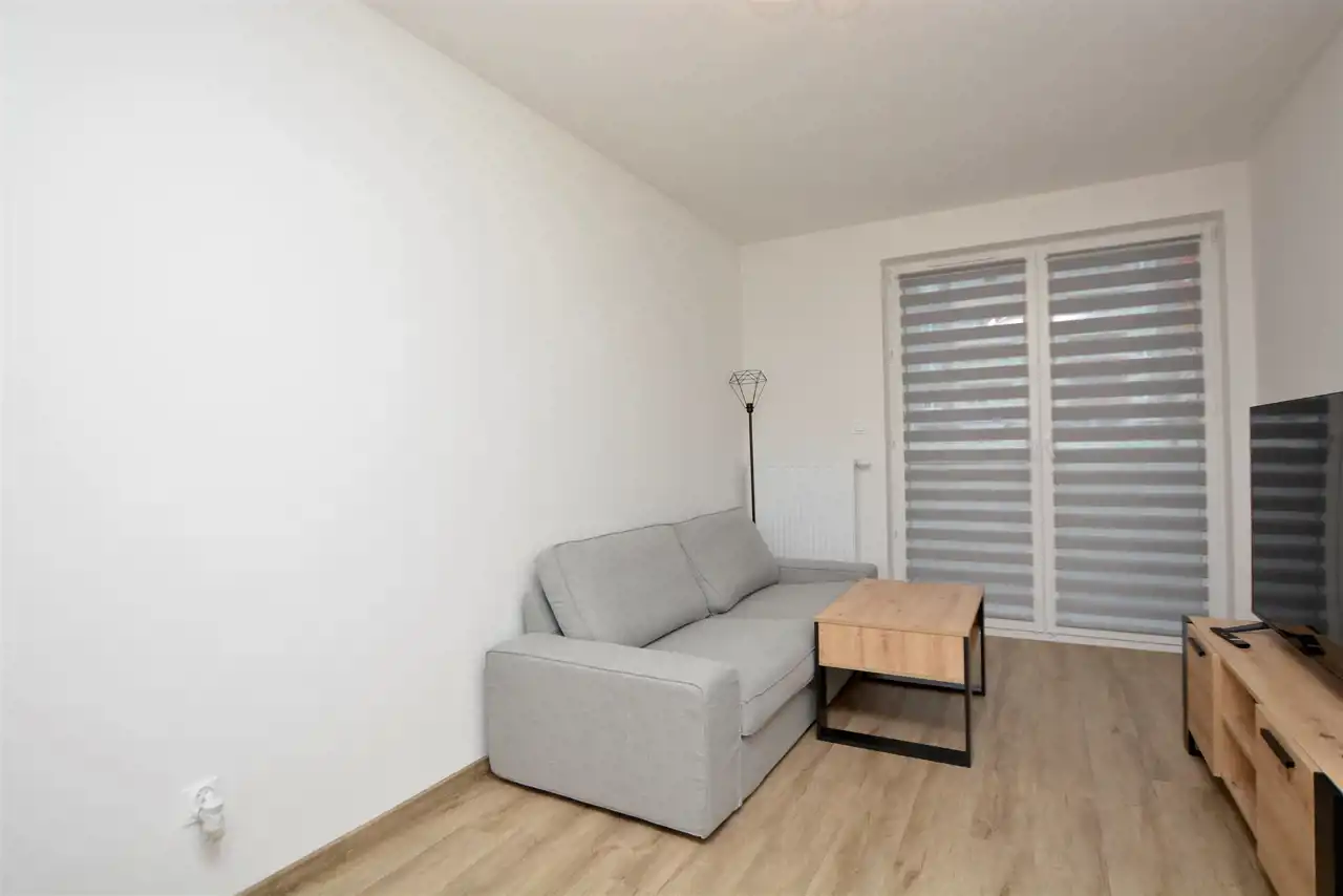 Mieszkanie umeblowane i wyposażone w niezbędne AGD: pralka, zmywarka, płyta indukcyjna, piekarnik, mikrofalówka w zabudowie, chłodziarko-zamrażarka.