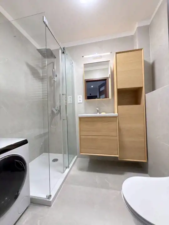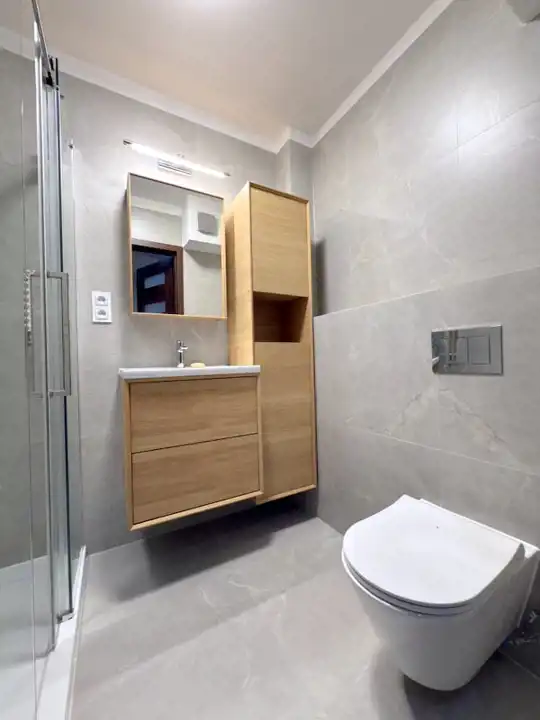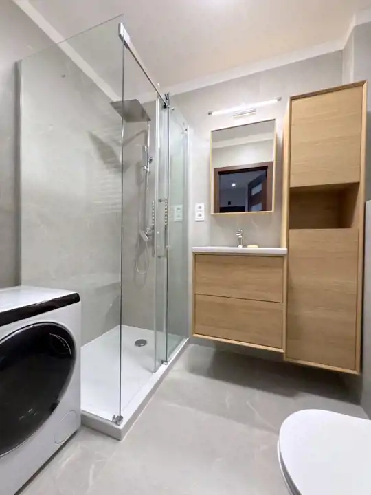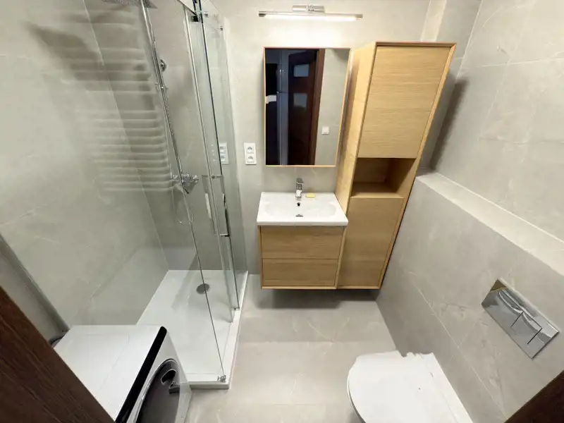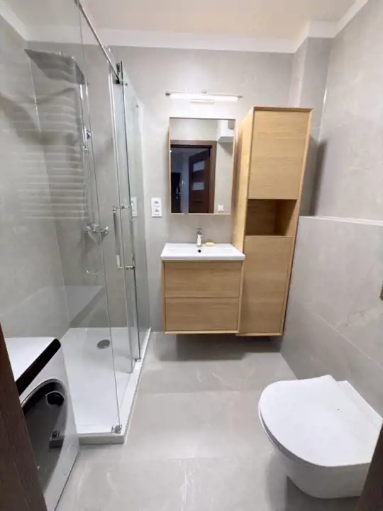 Łazienka z wc – prysznic, umywalka, pralka, pełna zabudowa, toaleta z bidetem;