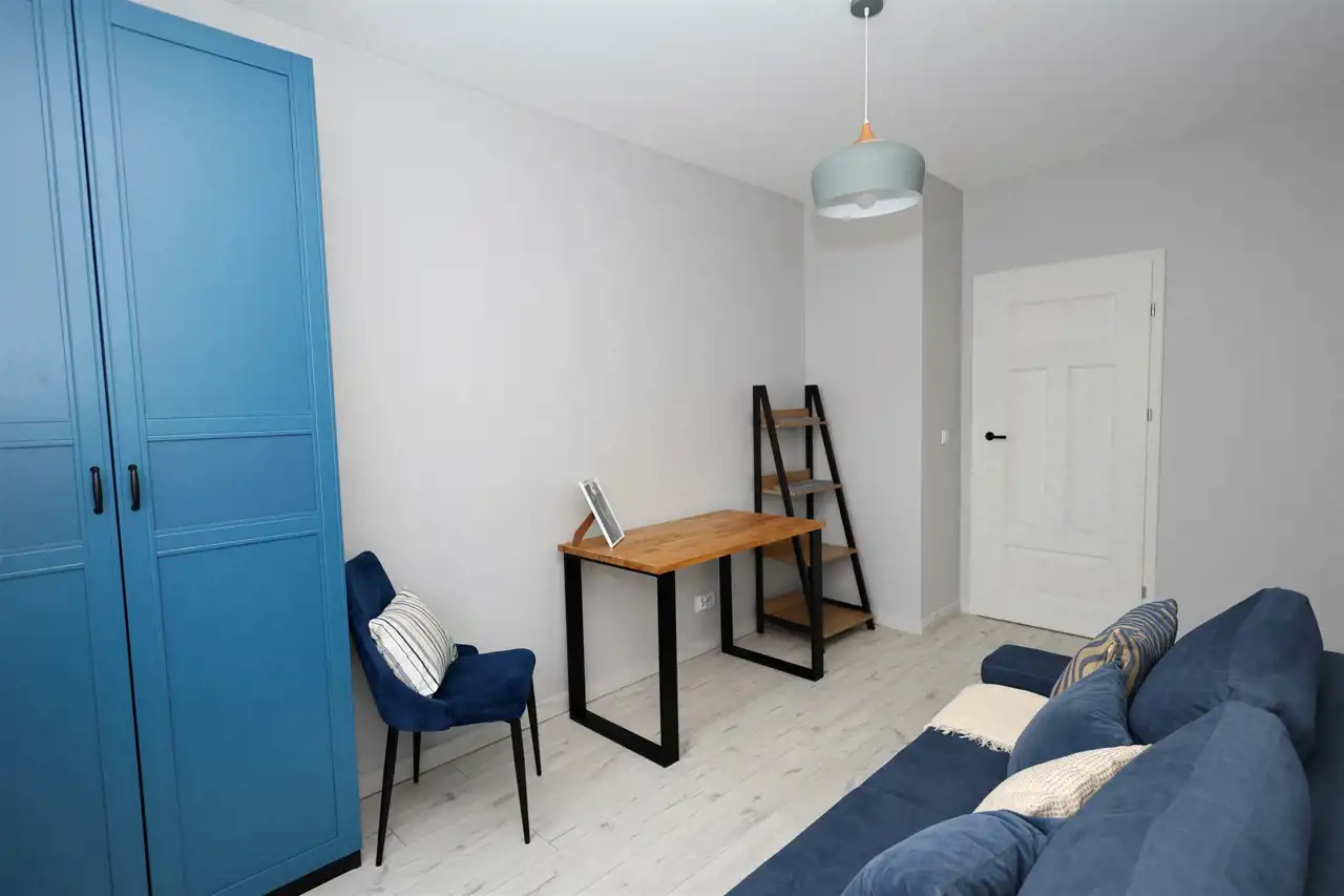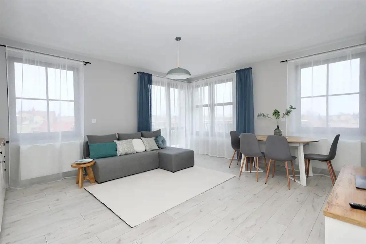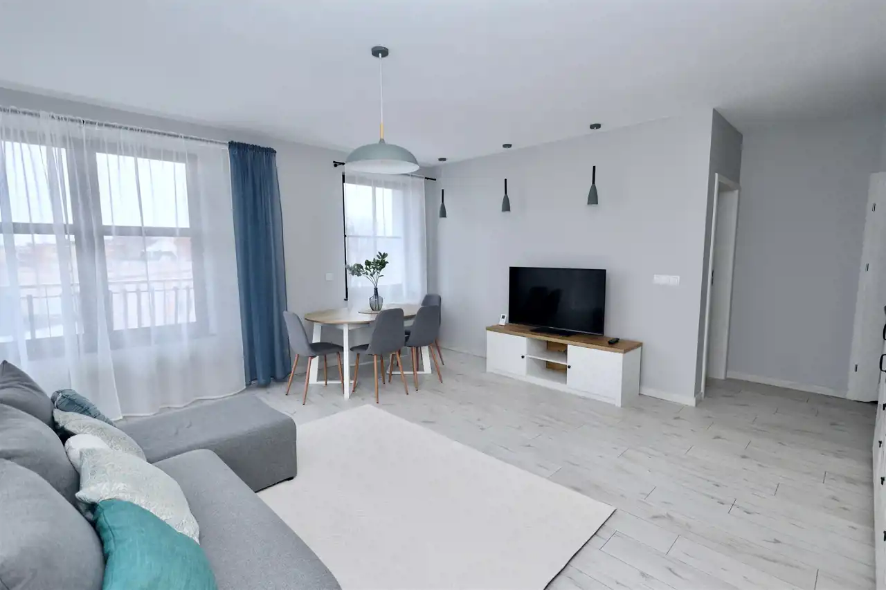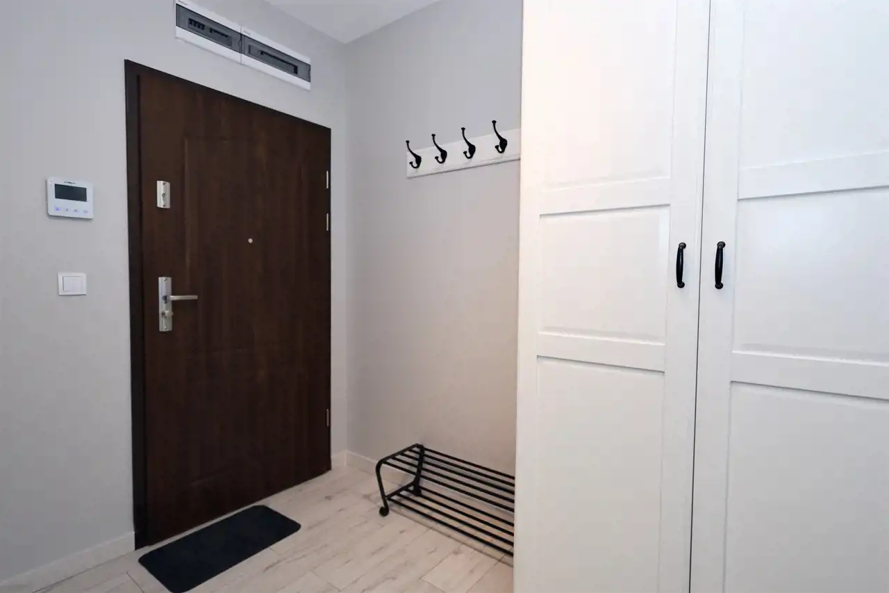 Apartament w pełni umeblowany i wyposażony w sprzęt agd: telewizor, chłodziarko-zamrażarkę, zmywarkę, piekarnik, kuchenkę mikrofalową, okap, płytę indukcyjną, pralkę i odkurzacz. We wszystkich oknach elektryczne rolety zewnętrzne.