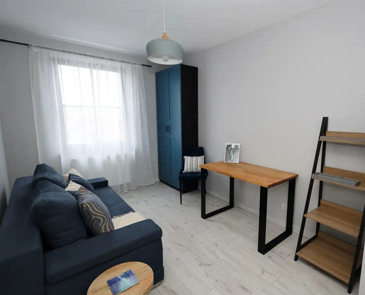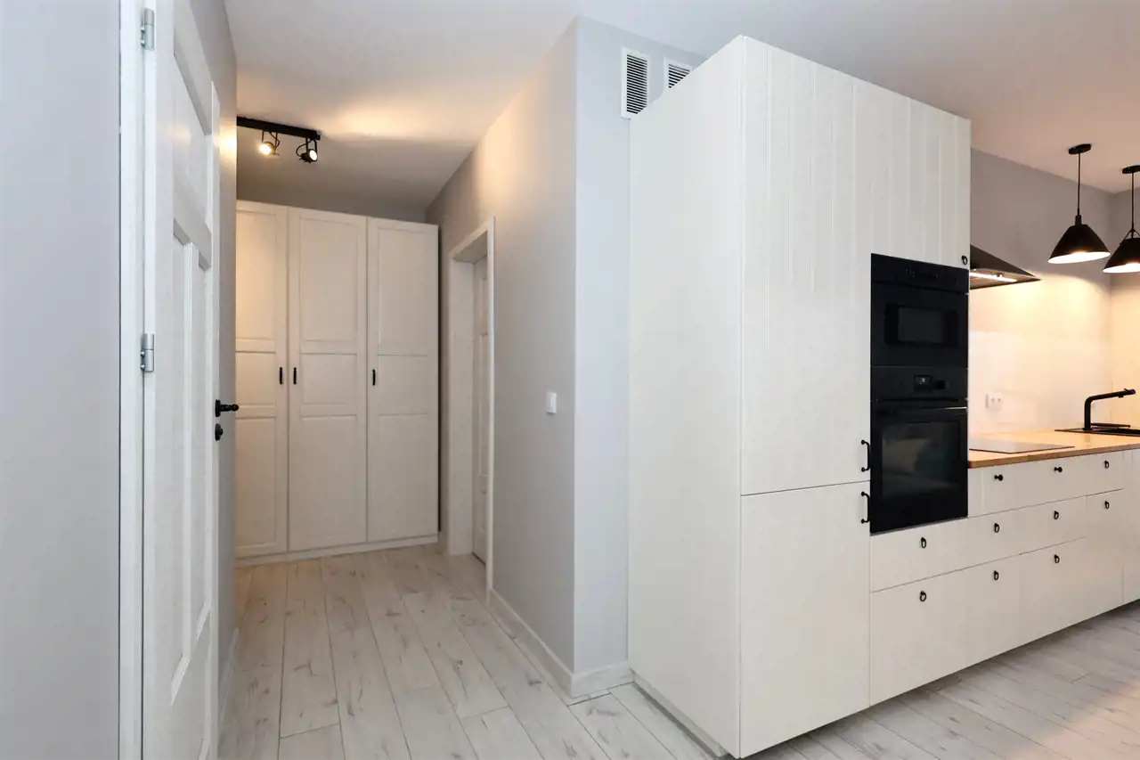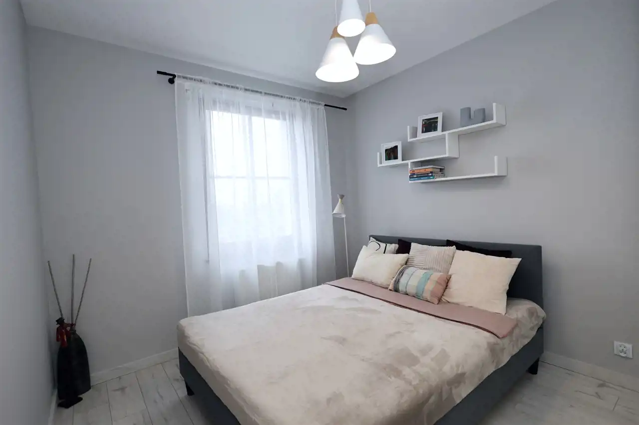 Apartament w pełni umeblowany i wyposażony w sprzęt agd: telewizor, chłodziarko-zamrażarkę, zmywarkę, piekarnik, kuchenkę mikrofalową, okap, płytę indukcyjną, pralkę i odkurzacz. We wszystkich oknach elektryczne rolety zewnętrzne.
