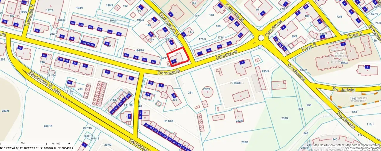 Powierzchni całkowita 469,90 m.kw (pow. zabudowy 127 m.kw). Budynek usytuowany jest na działce 0,0585 ha. Obiekt ogrodzony i składa się: dwóch pięter, poddasza oraz pomieszczeń piwnicznych. Dwa wejścia do budynku - główne od ulicy. Nieruchomość z przeznaczeniem na: siedzibę banku, przedszkole itp.....