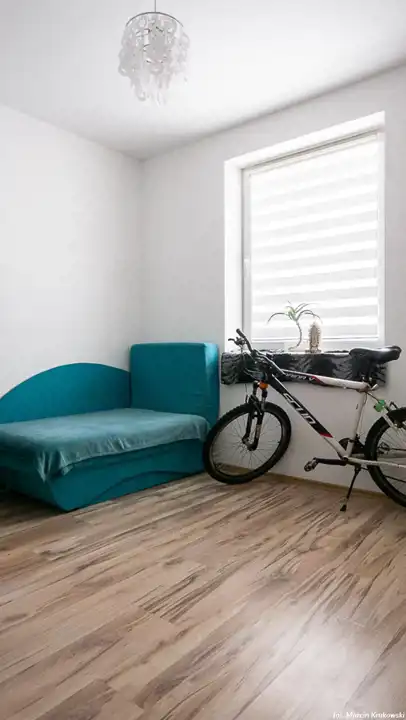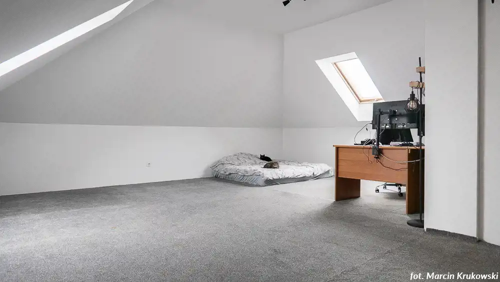 Na poddasze prowadzą solidne, drewniane schody. Na górze znajdują się dwa pomieszczenia – jeden duży pokój oraz jeden mniejszy – obecnie w stanie niewykończonym, co daje możliwość aranżacji według własnych potrzeb.