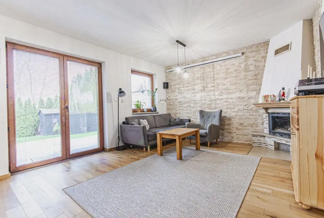 W salonie położona została naturalna deska dębowa (2 lata temu), która nadaje wnętrzu ciepły, domowy charakter. Dom jest dobrze ocieplony, posiada ogrzewanie gazowe, ogrzewanie podłogowe w przedpokoju na parterze, kanalizację miejską oraz własną studnię głębinową ze sterownikiem inwerterowym.