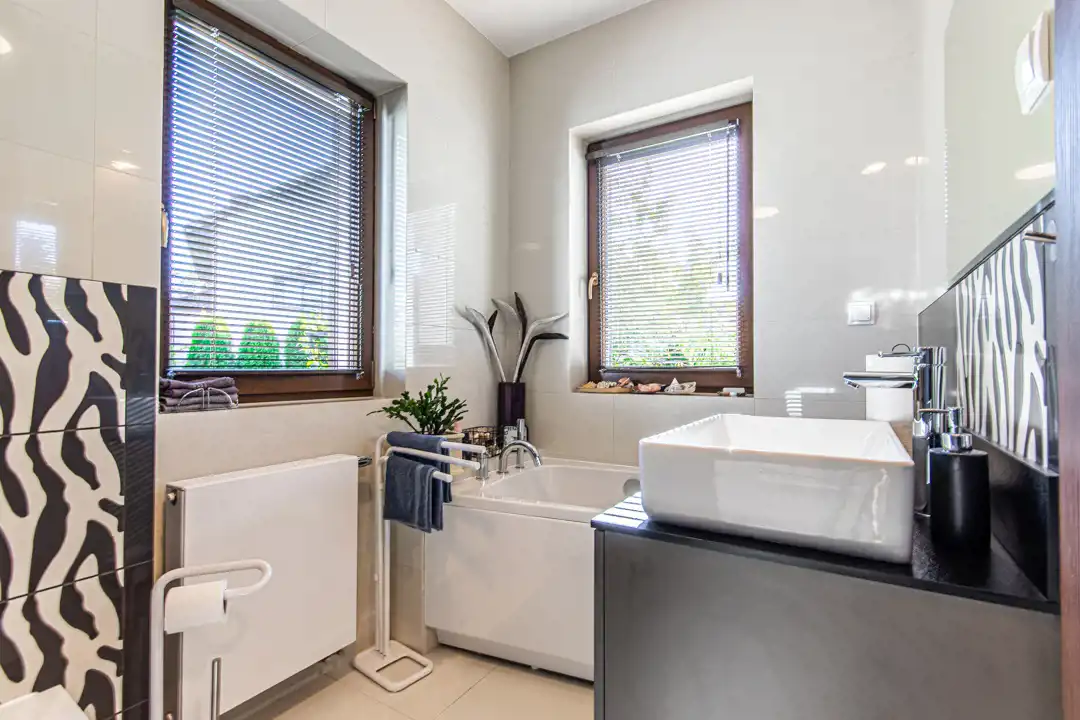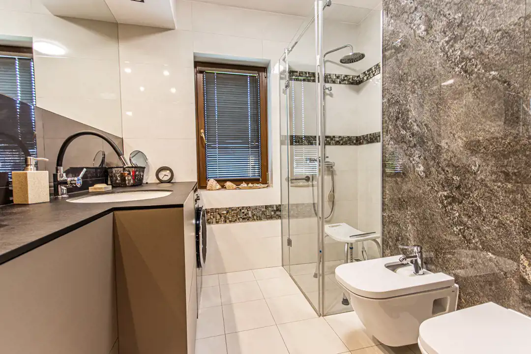 wysokiej jakości wykończenie – gres wielkoformatowy w łazienkach i na parterze,